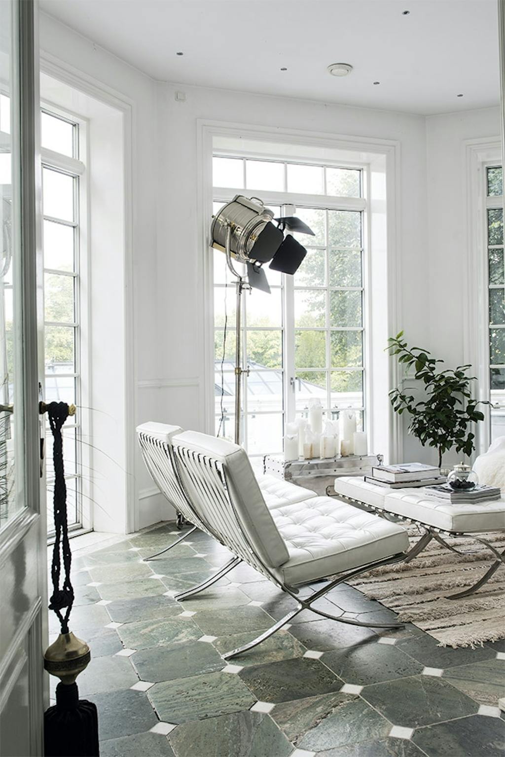 til den pragtfulde have. Mies van der Rohes Barcelonastole står på et tæppe fra Marokko og fint oplyst af filmlampen fra Restoration Hardwear, USA.