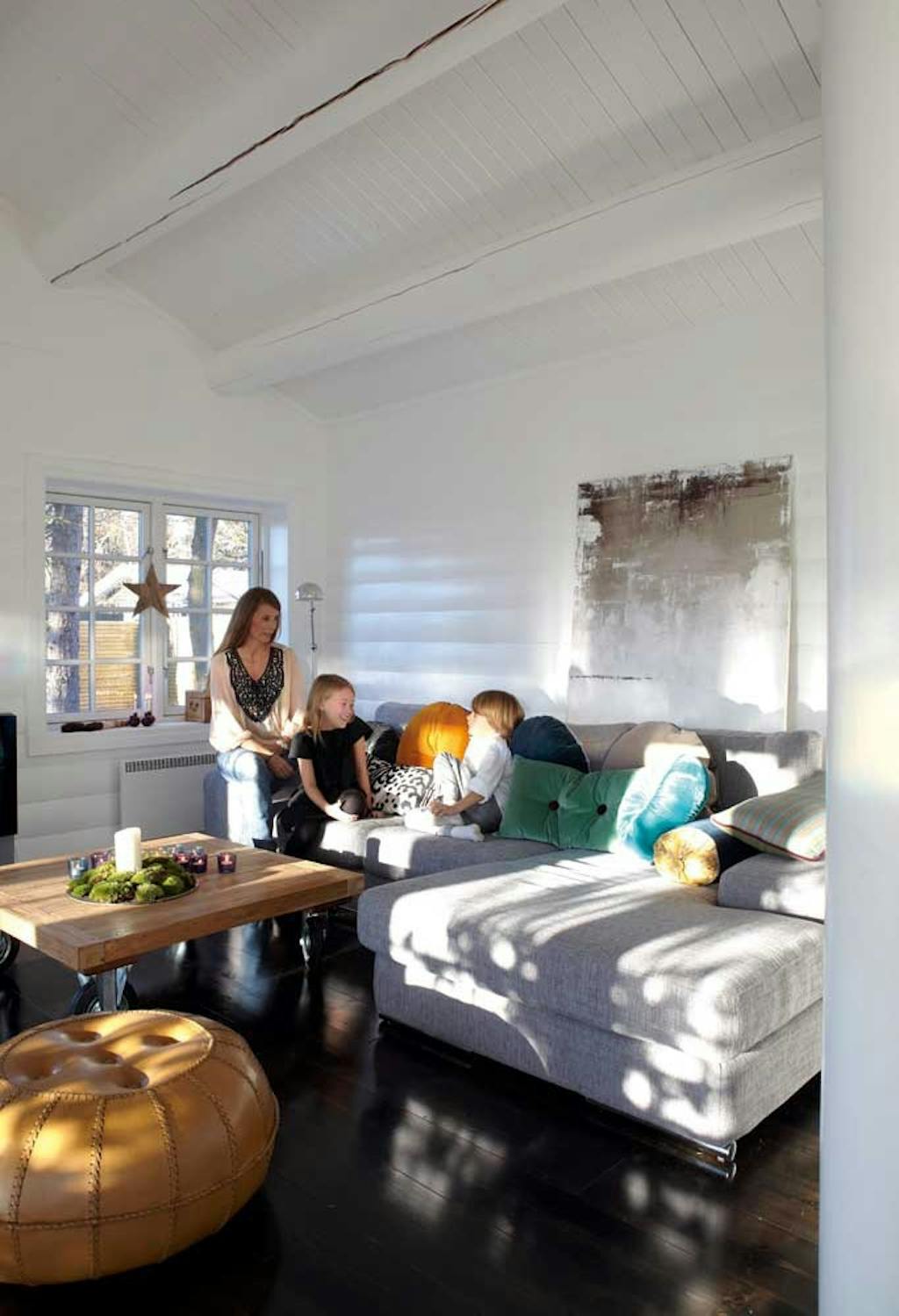 Familien har rejst meget Asien, og derfor er en del af hjemmets interiør bragt med hjem fra disse ture. Sofabordet er lavet af rustikke træplanker og er fundet på Bali, ligesom de to gyldne puffer i kernelæder også er hjembragt derfra. Sofaen fra Ilva er det hyggelige omdrejningspunkt i stuen og indbyder til afslapning og tv-kiggeri.