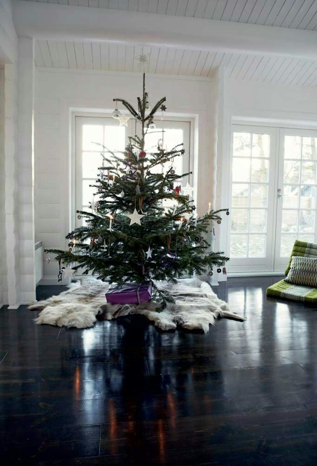 Et traditionelt juletræ i dansk gran har god plads i bjælkehyttens stue og hviler på bløde rensdyrskind. Sammen med børnene har Anne Dybdahl Frandsen pyntet træet med en blanding af forskellige sølvkugler og kogler, stjerner i papir og sælskind, indiske figurer af stof og chokolade ophængt i gavebånd.