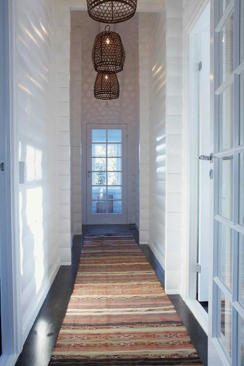 Lamperne i gangen i gangen er hønsekurve, som familien har haft med hjem fra deres mange ture til Bali. Kurvelamperne afgiver det fineste - og meget juleaktuelle - stjernemønster på gangens hvide vægge, når de er tændt. Kelimløberen er købt i Danmark hos Persodan.