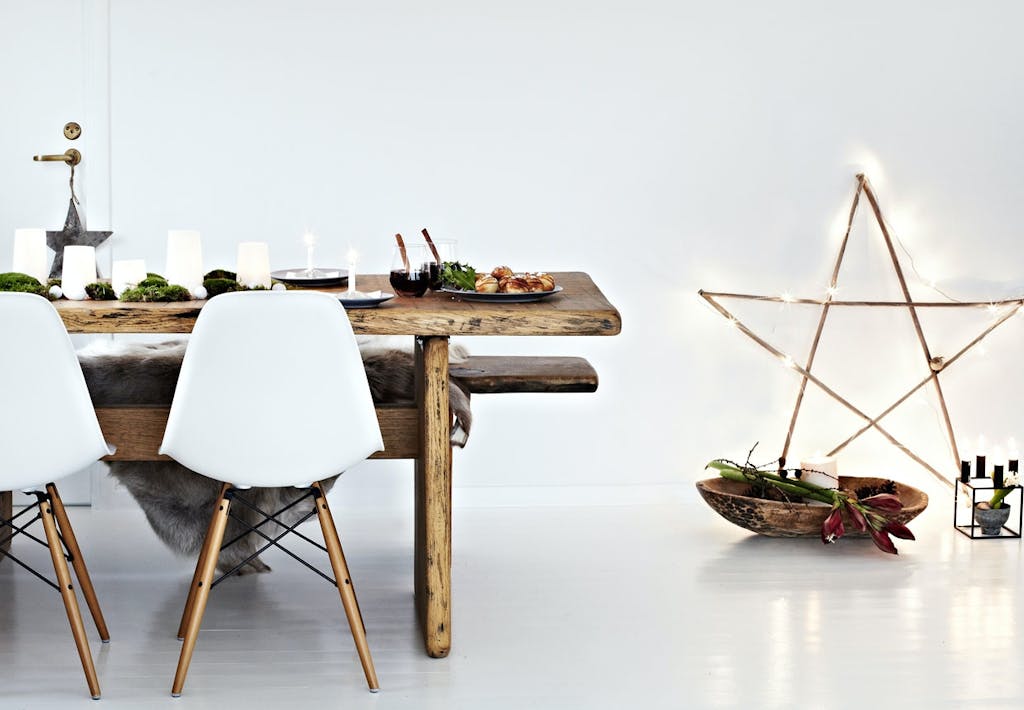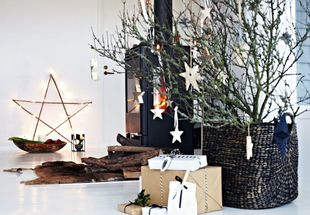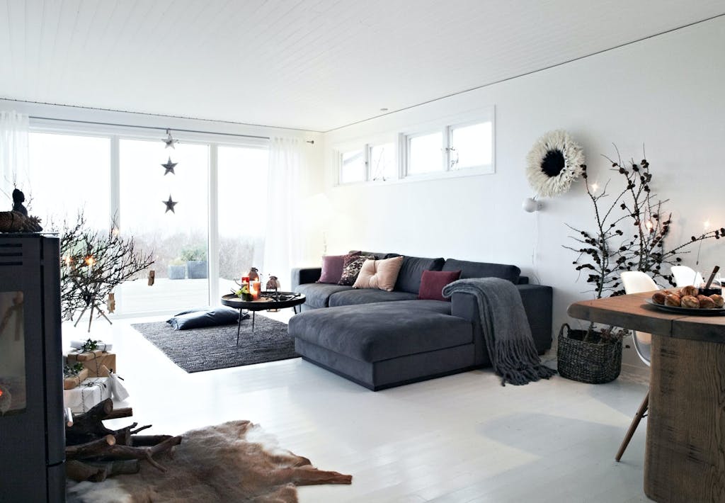 I stedet for konceptuelle dekorations-strategier og koordinerede farvetemaer har Maria valgt at lade de fleste kasser med julepynt blive hjemme og supplere indretningen i huset med naturlig pynt fra den omkringliggende natur. Store og små grene, kviste, mos og kogler, familien finder på deres daglige gåture i bakkerne, bliver forvandlet til smuk og rustik pynt i den lune stue.