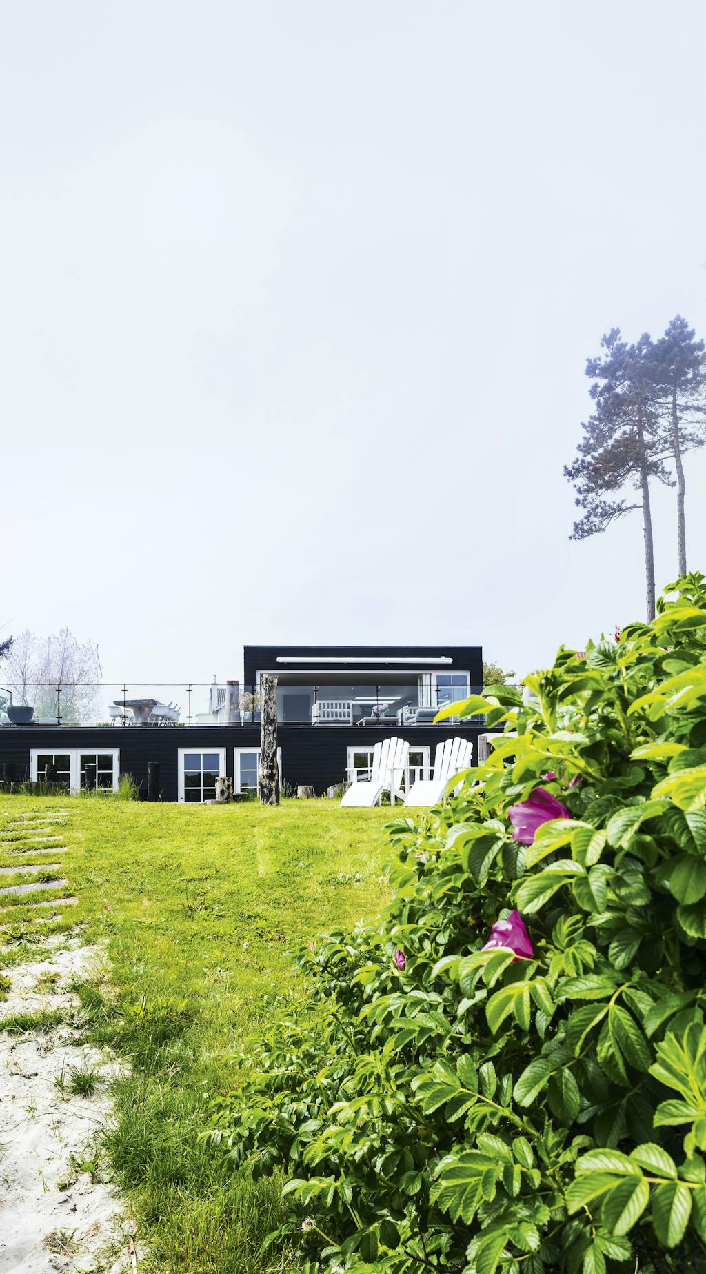 Familien tegnede og byggede selv huset, en flad, lav, stramlinjet sort kasse, efter at have kasseret et oplæg fra en arkitekt. Der har en klar reference til de gode gamle danske sommerhuse - et sortmalet træhus med hvide vinduesrammer. Men dér hører nostalgien også op. For både eksteriør og interiør minder mere om et luksusresort.