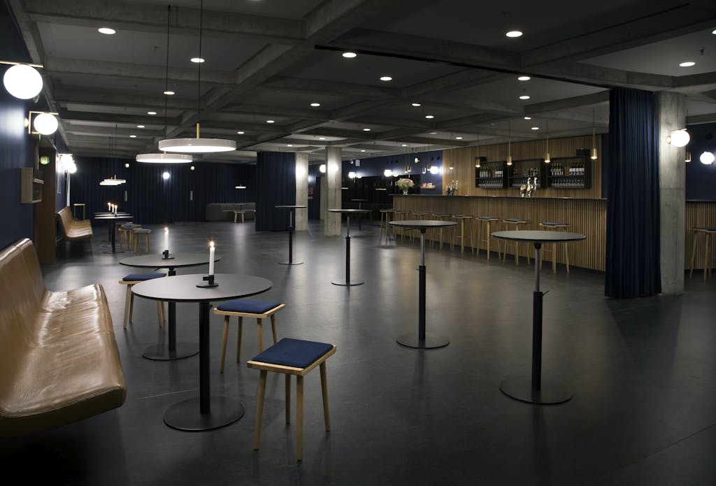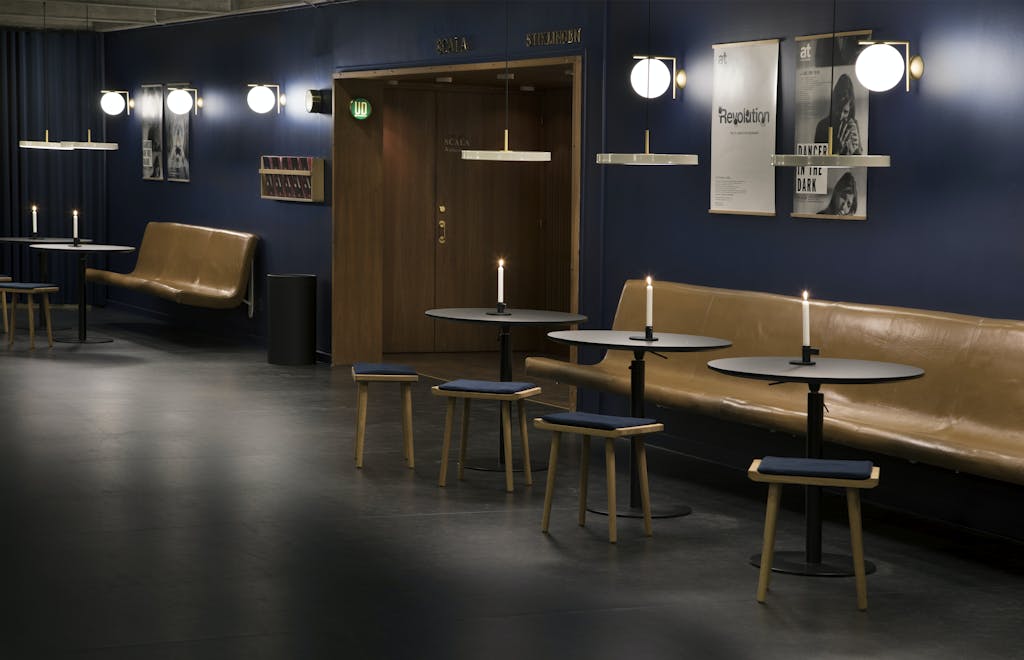Med mørkeblå vægge, messing og interiør i træ går teatret hånd i hånd med de nordiske indretningstrends.