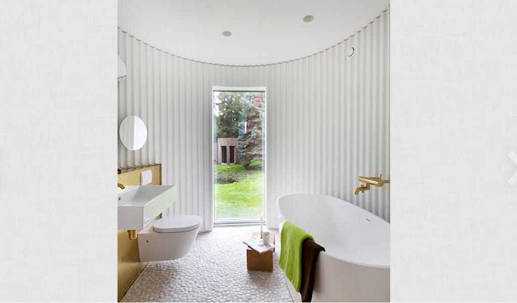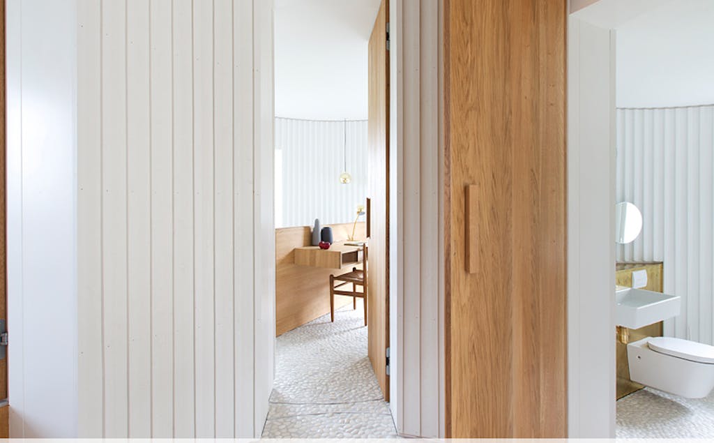 Ferieboligen Birkedal er beklædt med granrafter yderst. Det patinerer smukt med årene. Væggene indenfor er malet kridhvide, og det giver et helt særligt lys. Der er noget næsten Arne Jacobsensk over måden, rummene buer på.