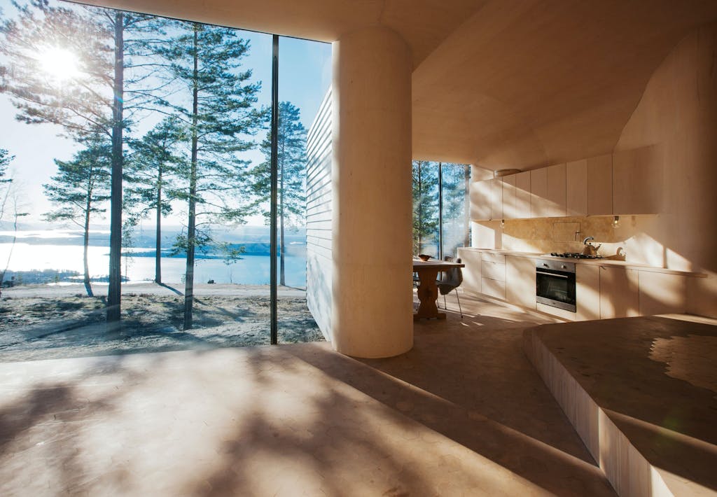 Læs også: Vil du flytte sammen med et træ? I det centrale rum er vinduespartierne store og folder en vidunderlig udsigt ud for beboerne. Midt i rummet hænger en kamin, der - takket være rummets transparence og vue ud på skov og sø - virker som et lejrbål midt i naturen.