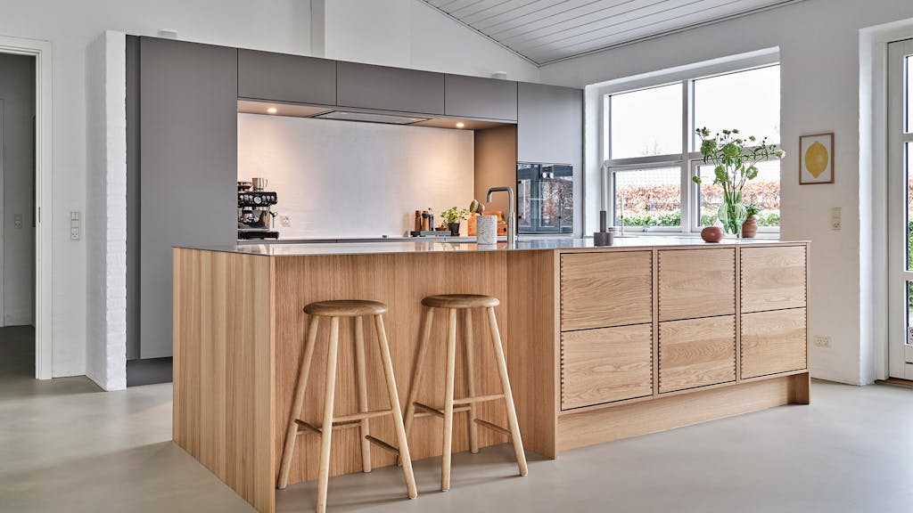 Højskabene er indbyggede i væggen og rummer køleskab, flere ovne og en kaffemaskine. Både skabene og den over tre meter lange køkkenø er designet med fuldfineret ramme og træfronter med et råt, mørkt udtryk.