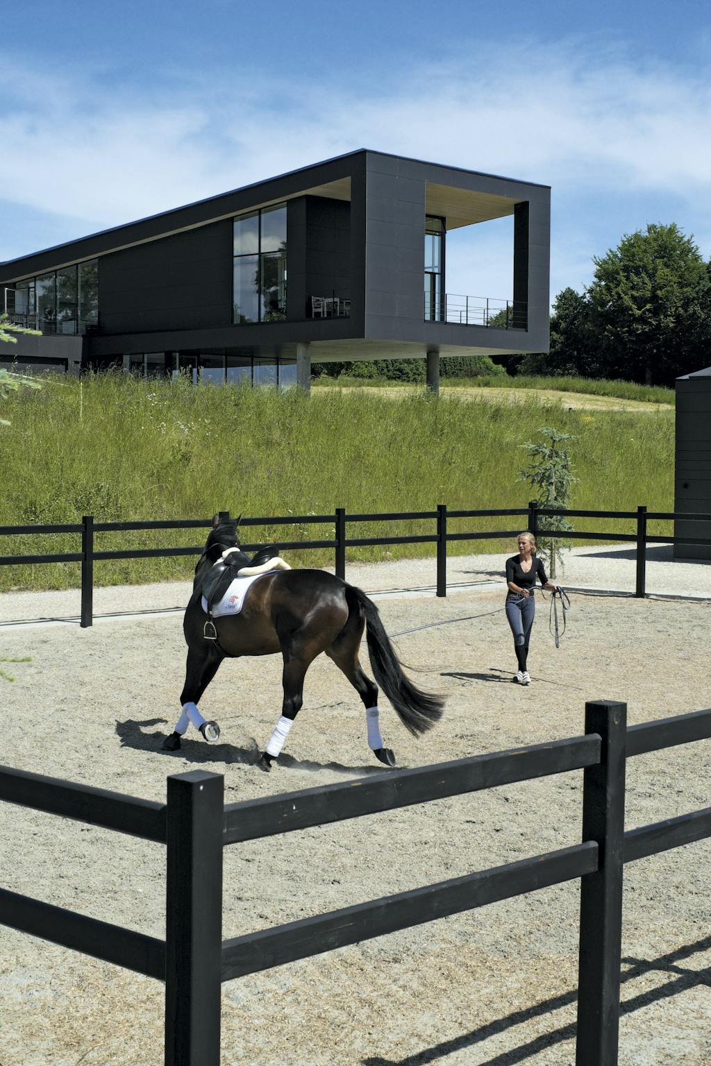 Hvis man forestiller sig, at James Bond nynner den kendte danske børnesang “Jeg en gård mig bygge vil”, og en bygning derefter mirakuløst åbenbarer hans ønske, ja, så kunne hans gård muligvis se sådan ud. I al fald taber man både næse og mund, når man her nord for København kører rundt i svinget, og det sorte glashus manifesterer sig i horisonten. Lidt tættere på ser man nye sorte kasser i en stringent maskulin stil fordele sig nedenfor. Blødt op, når heste hist og her nysgerrigt stikker hovederne ud af vinduerne. Gården, som familien kalder den, er det fysiske udtryk af en vision om at bygge en moderne bondegård - velfungerende, praktisk og miljømæssigt i top med udnyttelse af de bedste energiformer. Og tegnet i en gennemført arkitektonisk stil af et af Danmarks og såmænd også verdens førende arkitektfirmaer. Michael Ring er ejer og direktør for et af dansk designs mest anerkendte varemærker, og er man kender af Steltons design, bliver man egentlig ikke overrasket over stilen i bygningen. Minimalisme og rene, flotte klare former er sammenfaldende ingredienser i bygning og design. - Vi var på vej i en ny livsfase, fordi vores to børn var