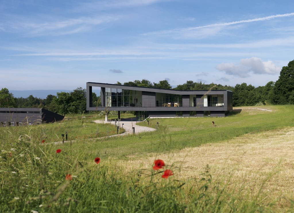 - Vigtigt var det med brug af så meget sort materiale. at bygningen næsten kun berører landskabet, hvor fundament og søjler nærmest fjerlet finder fodfæste, ellers ville stuehuset blive alt for tungt, siger Søren Øllgaard. Energimæssigt rangerer bygningerne som energiplus-huse, hvor jordvarme og solenergi står for det meste forbrug.