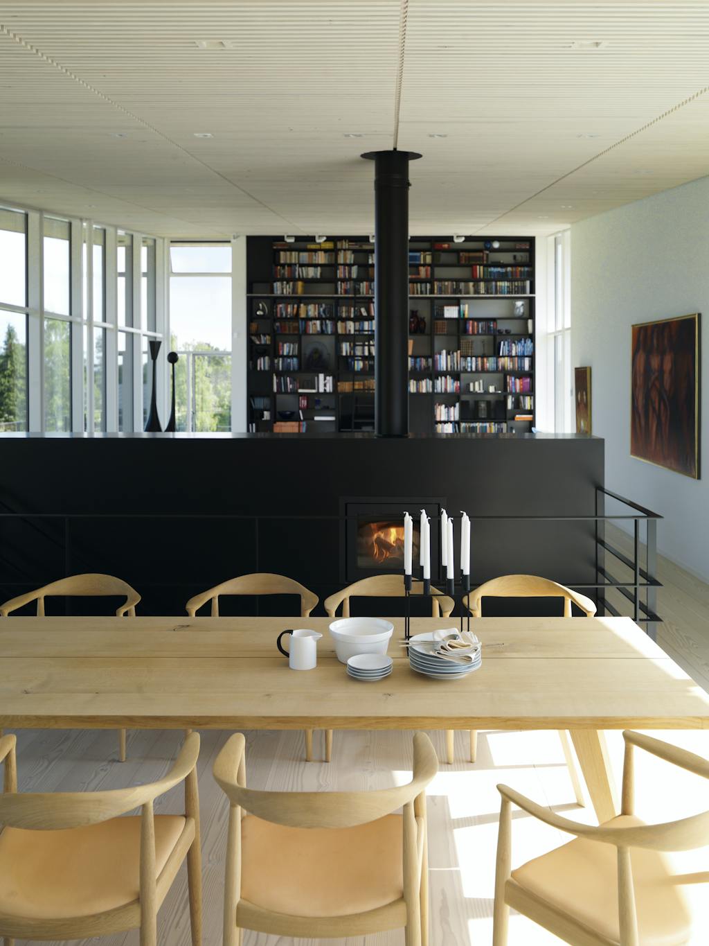 Brændeovnen deler det store rum naturligt op, og den kan ses fra begge sider. Det røde billede er af Inger Hansen. Spisebordet med plads til 12 står Spot on for, og rundt om bordet står et af Wegners mesterværker Den Runde Stol, kendt fra tv-duellen i 1960 mellem Nixon og Kennedy. På bordet ses stel fra Royal Copenhagen og design fra Stelton.