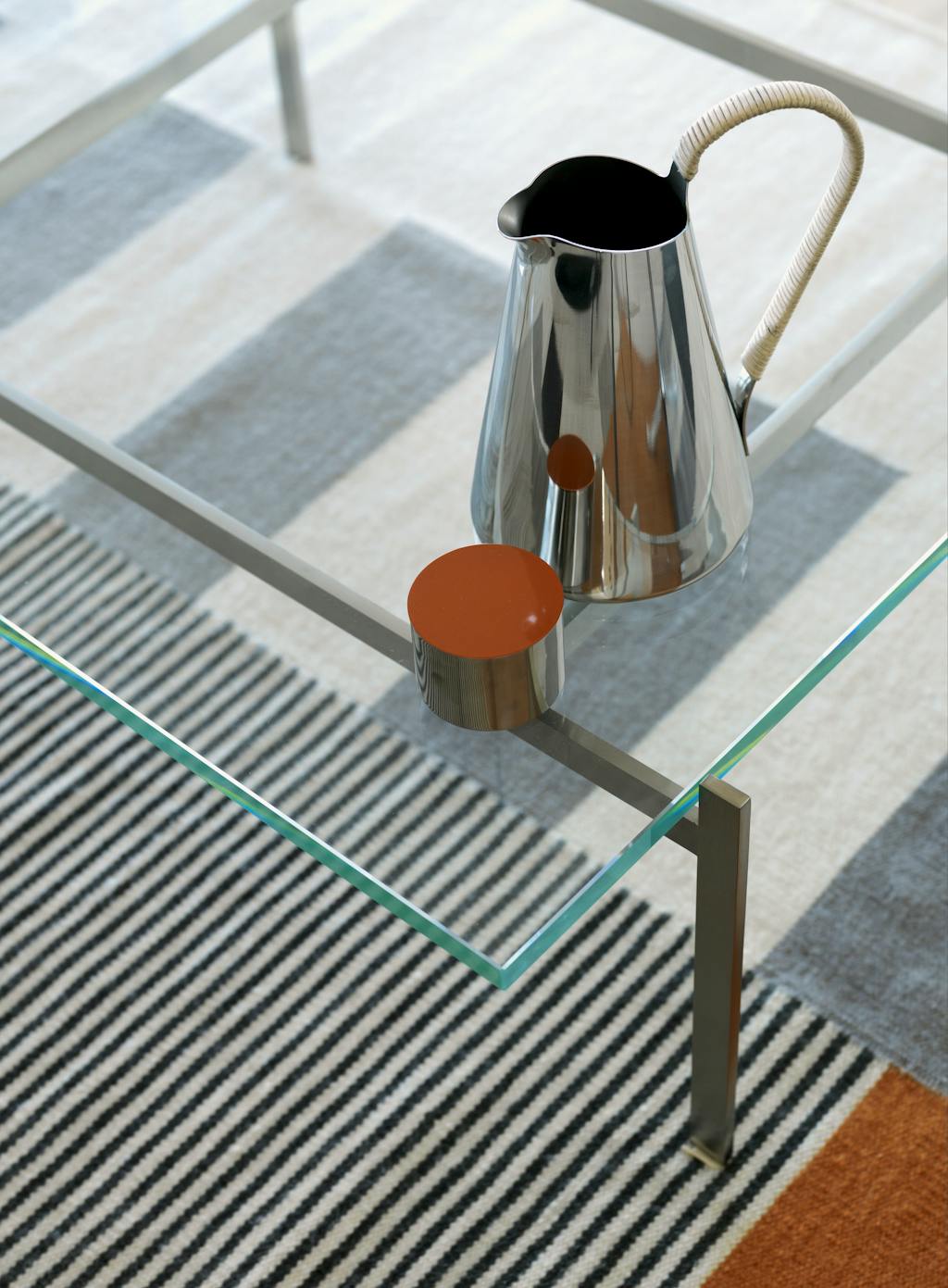 På bordet Dot af Paul Smith og en ny kande, begge fra Stelton. Tæppet er fra Linie Design, og gulvene med de brede lyse planker fra Dinesen.