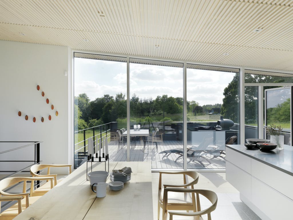 ved at blive voksne og flyttede hjemmefra. Vi overvejede at købe et lille hus tæt ved vand og havn, så man nemt kunne gå om bord på båden - og så ellers asfaltere haven, så vi ikke skulle bruge tid på den. Men Birgitte er vokset op på en gård og har en stor interesse for opdræt af dressurheste, så vores tanker begyndte at bevæge sig over mod et liv på landet. Jeg interesserer mig for moderne arkitektur og havde på ønskelisten BIG eller Henning Larsen Architects, og det blev sidstnævnte, vi kontaktede, da vi havde den rigtige grund.