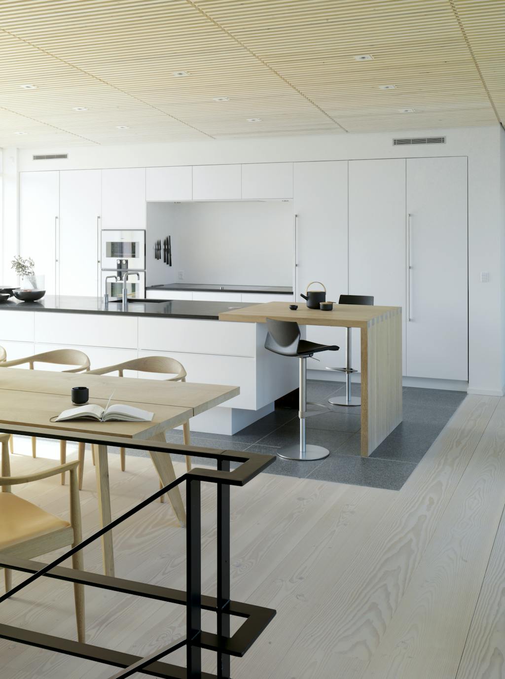 Møbler, arkitektur og design går op i en højere enhed med tre gange Poul. Poul Kjærholms glasbord PK61 og de mørkebrune Poul M. Volther-Coronastole, som adskillige gange har været brugt i fremtidsfilm, giver stærke skulpturelle linjer til rummet.