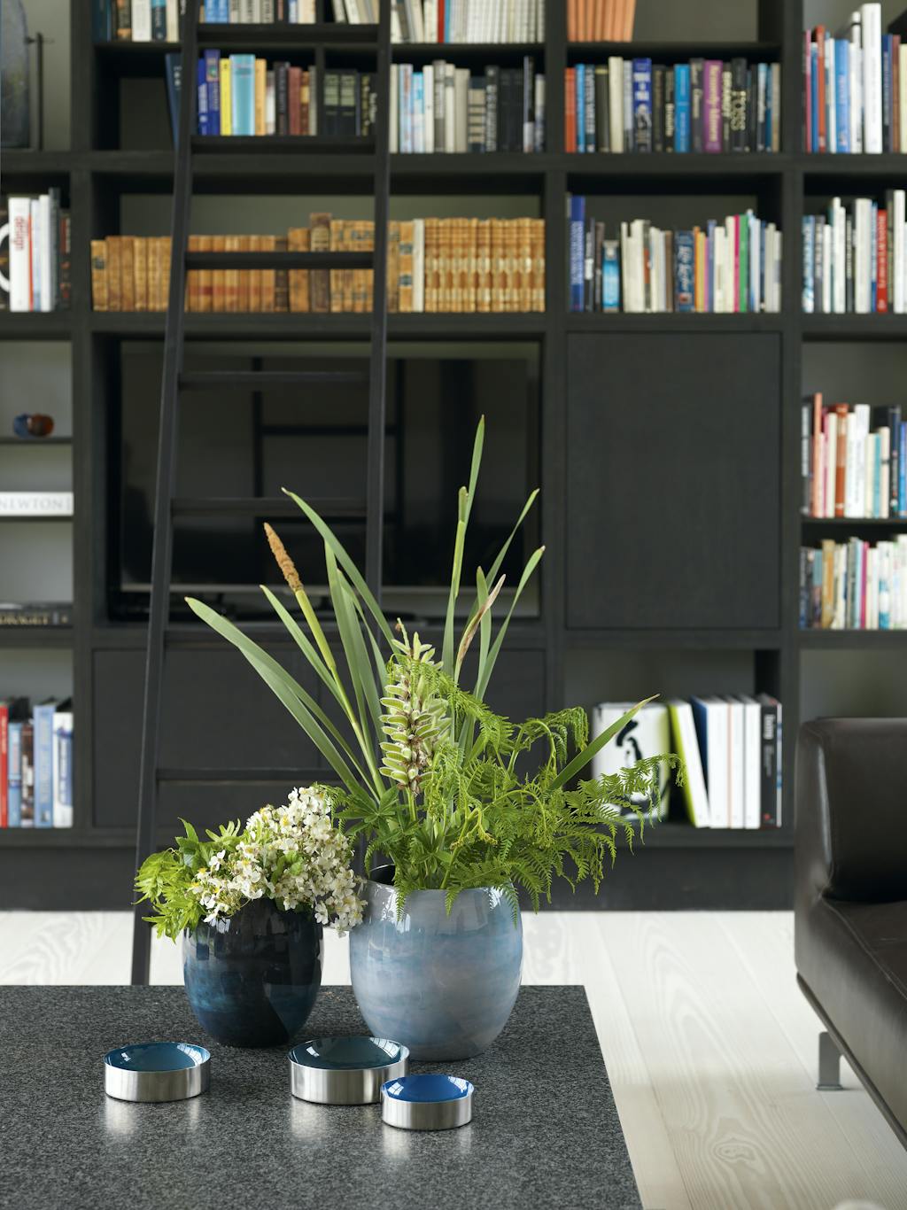De changerende blålige vaser på sofabordet er fra et Stelton-projekt, her sammen med Paul Smiths Dot-skåle.