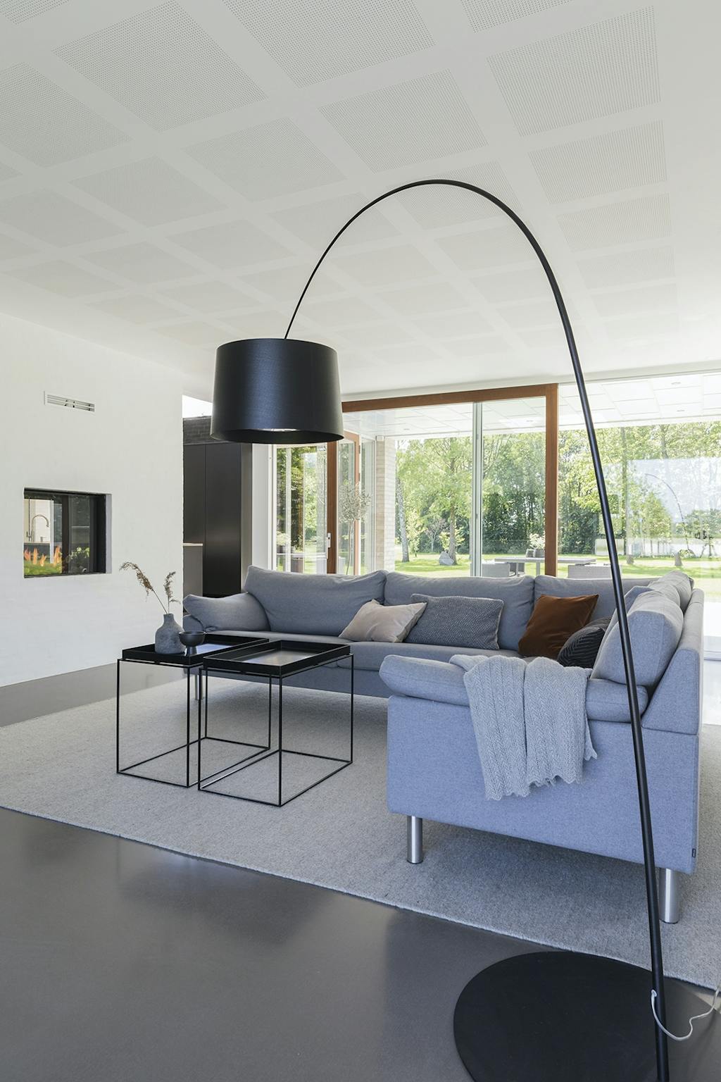 En indbygget gaspejs fra Storm System skaber gennemsyn mellem køkken og stue. Indretningen i stuen er holdt i grå, som giver et harmonisk udtryk, der glider ind i husets materialevalg. Søren Lund-sofaen og standerlampen er fra Høgh Møbler, og bordene er fra Hay. Som en grå ramme om arrangementet ligger gulvtæppet fra Garant. Puderne er fra Aiayu, vasen er fra Muubs, og skålen er af Louise Smærup.
