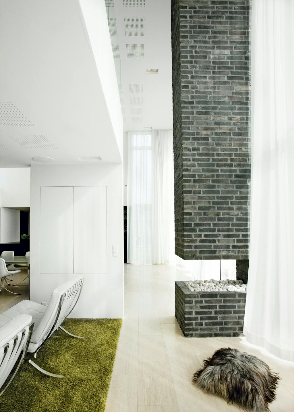 Den høje kasse er beklædt med zink, husets base er lavet i tegl, mens garagen er opført i IPE-træ. Udgangspunktet har været at gøre op med den normale opfattelse af at bo.