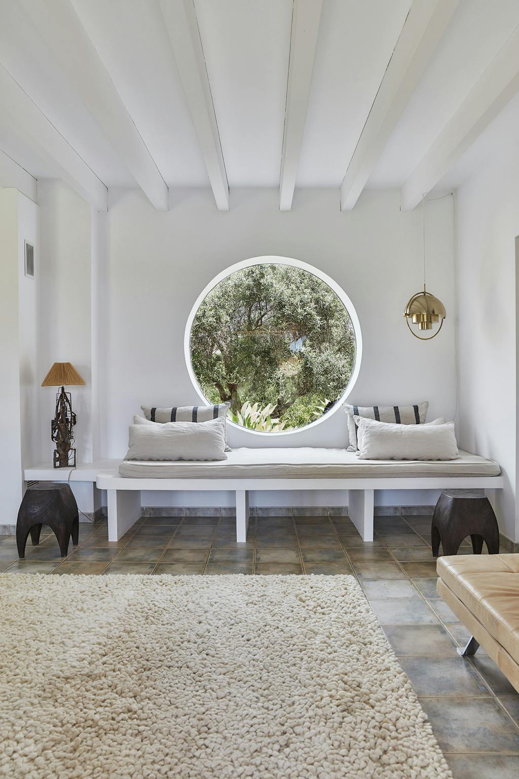 Da de satte huset i stand, valgte de at ændre minimalt. Men netop lyset var et af de områder, hvor de gav huset et løft ved at sætte et ekstra, stort, rundt vindue i stuen. De rev en væg ned for at få plads til et større køkken, som Lutz selv tegnede og fik bygget af en lokal snedker. Lågerne er lyseblå inspireret af de svagt blålige klinker, som de valgte at beholde overalt i huset.