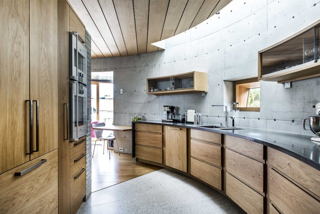 Det buede køkken er elegant udført i Dinesen-træ af den samme snedker, som lavede forskalilgsbrædderne, da murene blev støbt. Ved at bruge samme træ som gulv og loft skabes en sammenhæng, man sjældent har mulighed for at skabe i et hjem. Et lysindfald og et vindue over corian-bordpladen giver lys. Skabsvæggen, der dækker for køleskab og køkkenskabe, er bagsiden af den store murede pejs i stuen. Åbninger på begge sider og luft over skabsvæggen betyder, at køkkenet er skjult for nysgerrige blikke, men alligevel i kontakt med spisestuen. Hårde hvidevarer fra Gaggenau.