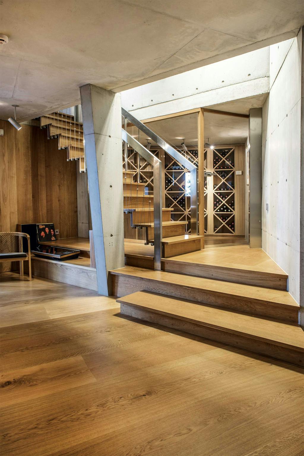 I kælderen ligger vinen på køl i de specialdesignede vinhylder. Trappen er i den ene side fæstnet til glasvæggen. Konstruktionen er så tung, at rammen i rustfrit stål måtte sættes på plads, før de indvendige mure blev opført.