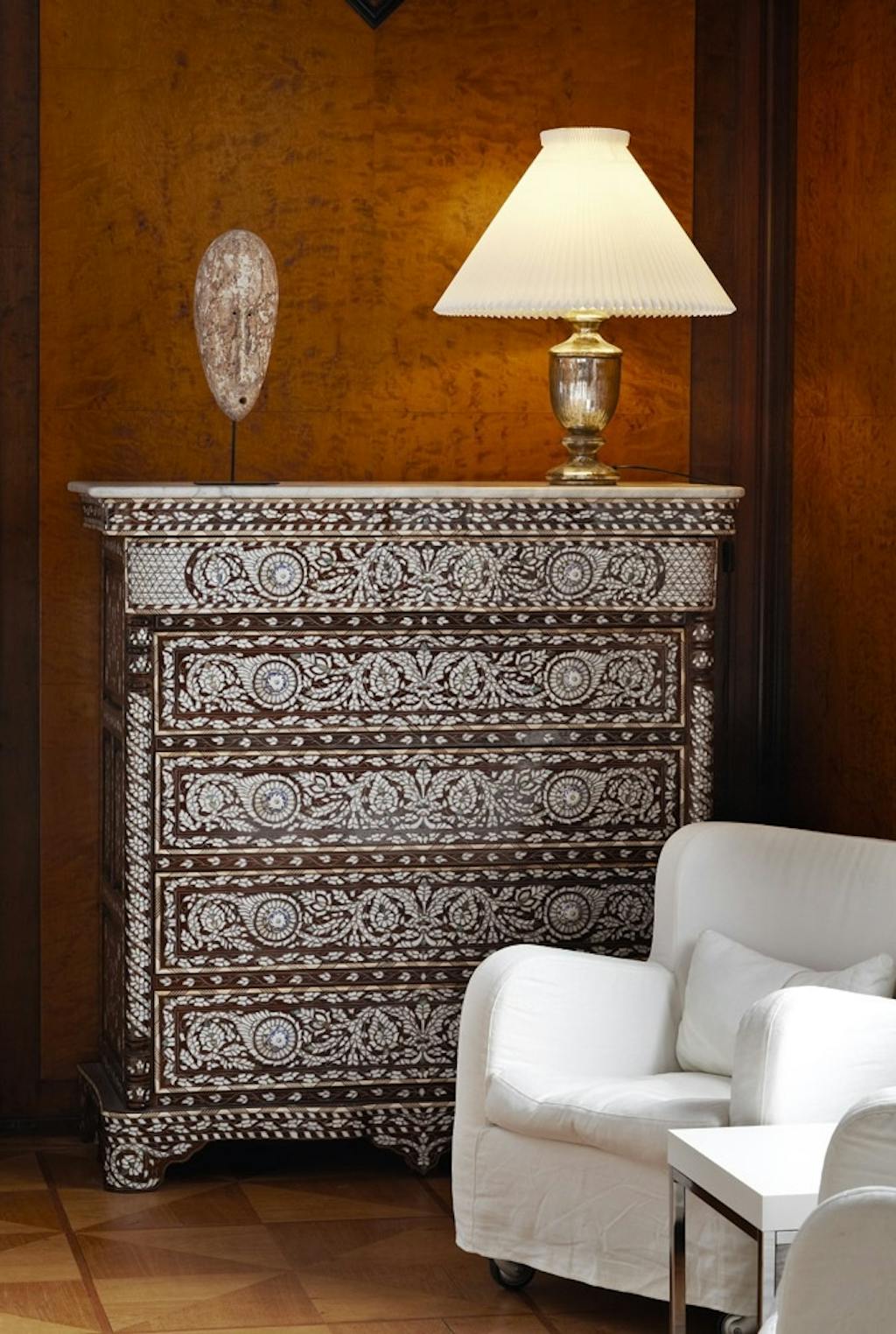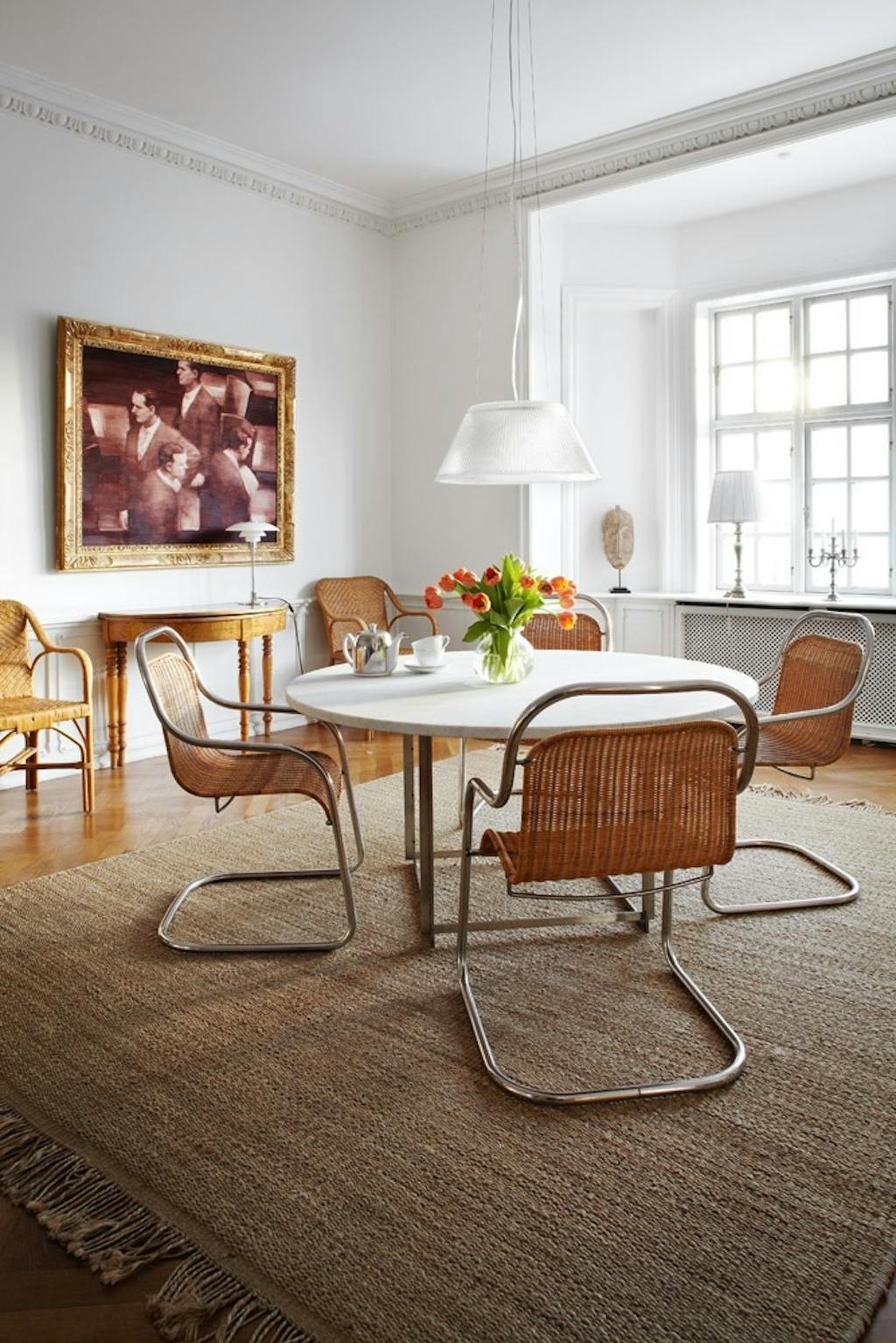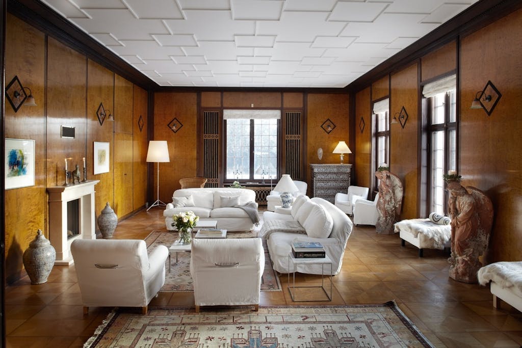 Først og fremmest i den næsten kvadratiske stue, hvis vægbeklædning i russisk birk forgylder atmosfæren i rummet, men det gyldne binder også bånd gennem møbler, gulve og tæpper.