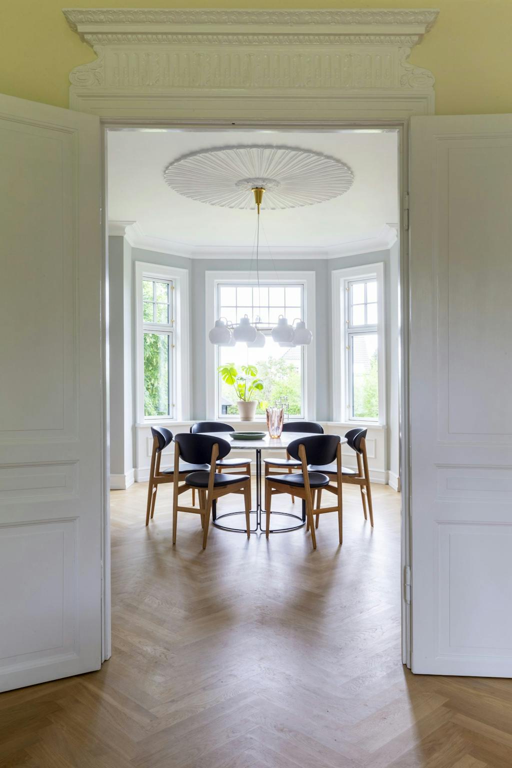 De herskabelige karme og høje paneler er genskabt efter husets oprindelige tidsånd fra starten af 1900-tallet.