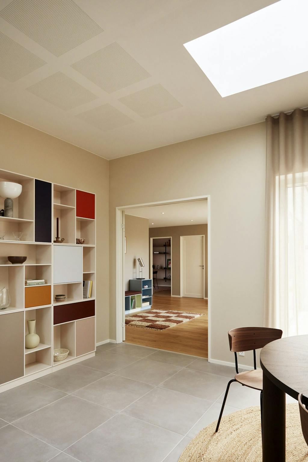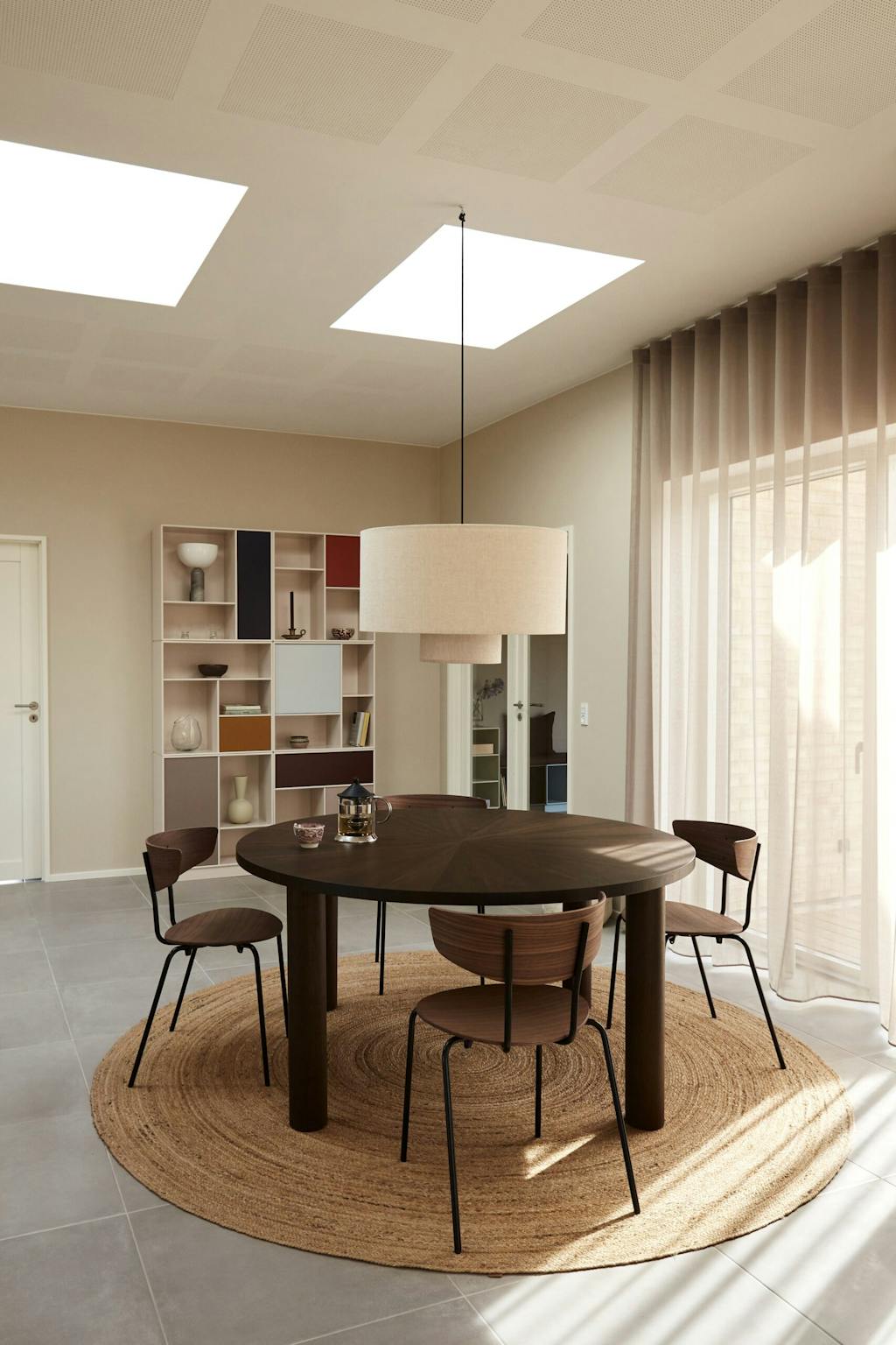 I spisestuen kan man forprogrammere en iscenesættelse, der både inkluderer musik, lys og gardiner. Lyset kan dæmpes eller farves, så stemningen bliver helt rigtig til enten hyggemiddagen eller festen. Alt kontrolleres på de “almindelige” kontakter fra Wiser. Pendel, spisebord og stole er fra New Works. Reol fra Montana.