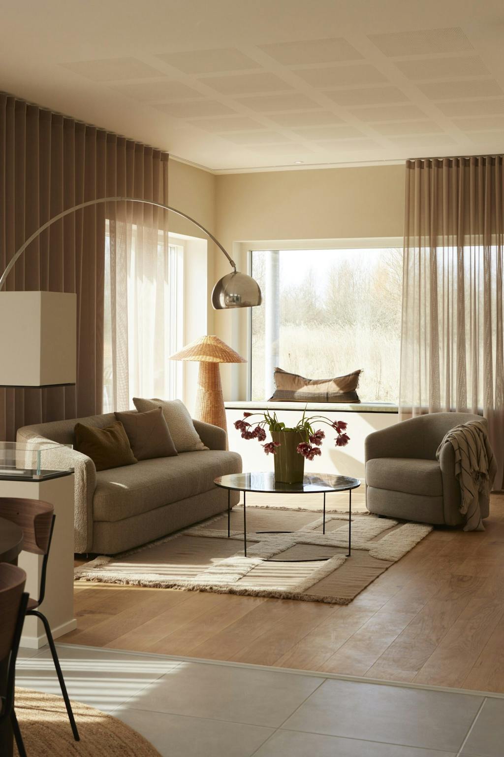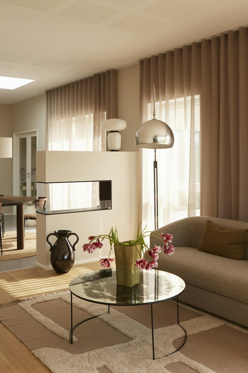 Huset her ligger i Nivå og er på 188 m2 og fyldt med smart hjem-løsninger. Pejsen i stuen fungerer som skillevæg og tændes op med biobrændsel, der skaber hygge og varme i årets mørke måneder. Gardinerne fra Kurage isolerer og styres fra mobilen, og bagved findes mørklægningsgardiner fra PoweredBlinds, så de optimale muligheder kan etableres til en hjemmebiograf. Puderne er fra IDcreAtions. Lampen Arco fra Flos er fundet vintage.