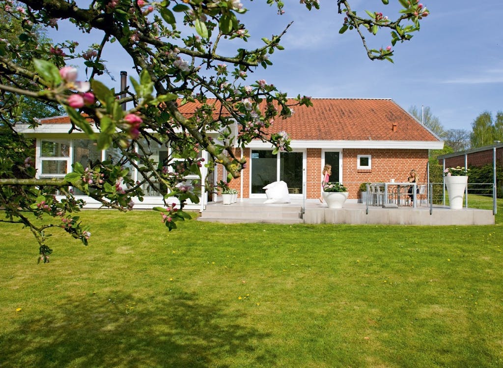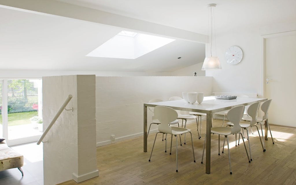 Bortset fra de utidssvarende badeværelser og det ditto køkken, som selvfølgelig har fået den store tur, så står parcelhuset stort set, som da det blev bygget, fordi husets disposition er så fornuftig. En rigtig god fordeling af husets 150 m² i gode værelser og lyse, rummelige fællesrum med loft til kip. Huset byder også på niveauforskel med kig imellem køkken-alrum og stue samt en udestue på 23 m², som trods det meget traditionelle ydre er et virkelig skønt rum med masser af lys og god kontakt til haven.