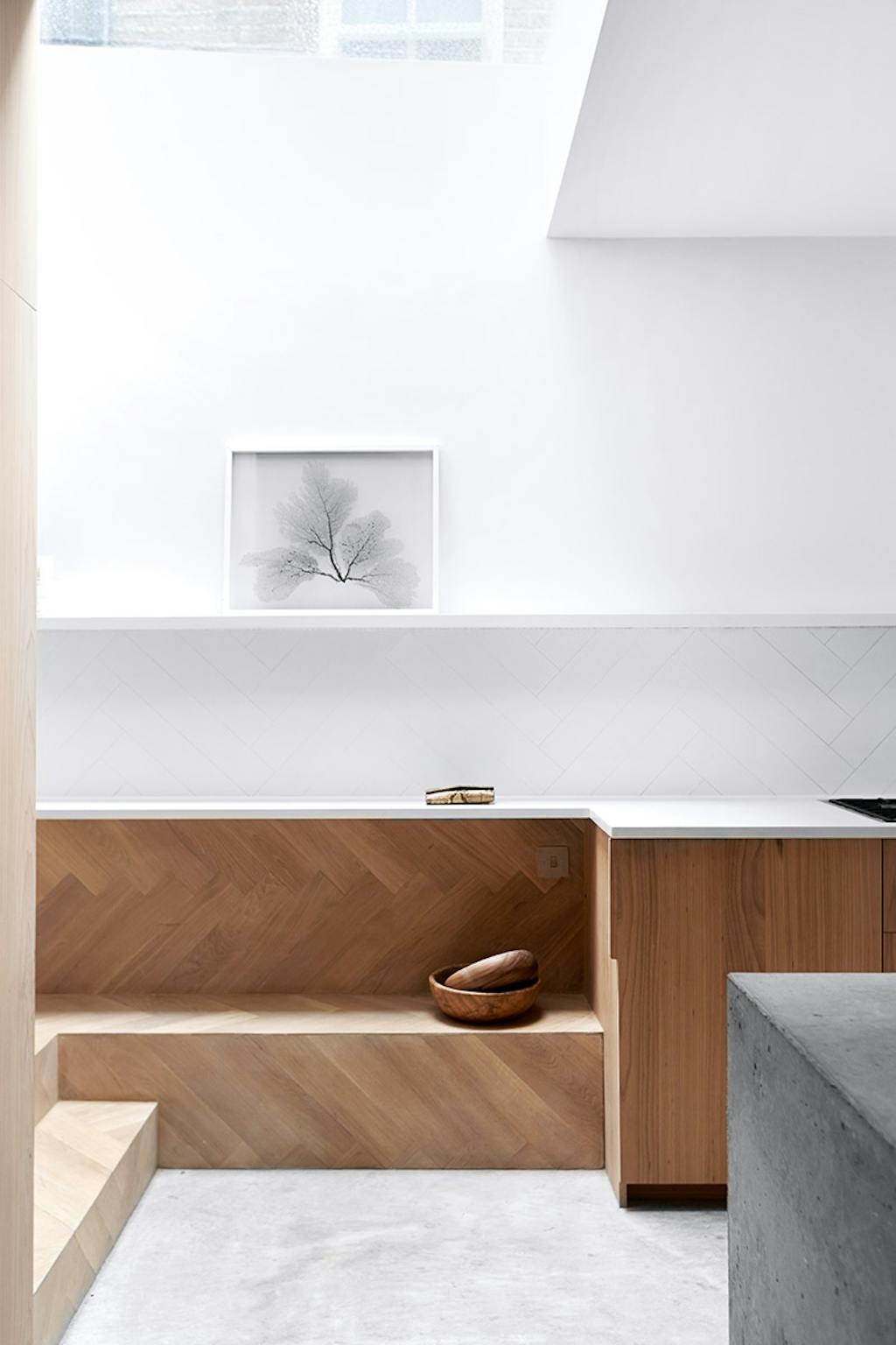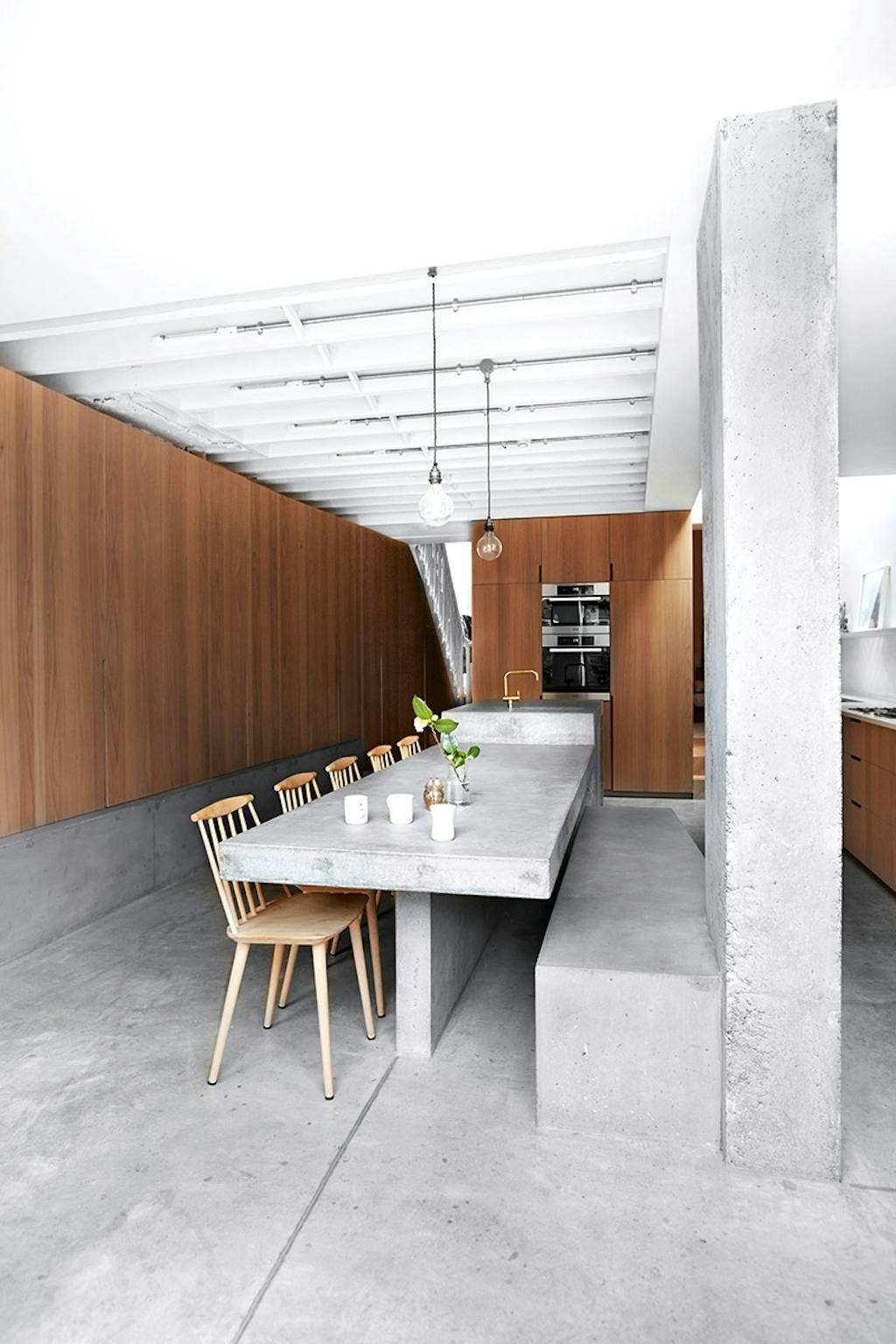 Den rå beton blødes op af honningfarvet elmetræ fra den specialdesignede skabsvæg, der løber langs hele køkkenet som en ensartet flade. Løsningen skaber visuel ro – ikke mindst fordi al køkkenudstyr og nips er gemt inde bag lågerne. En trio af industrielle lamper fra Urban Cottage Industries hænger over køkkenbordet med J77-spisestuestole af træ fra Hay, som giver varme til den kølige beton. De gyldne vandhaner er KV1 fra Vola.