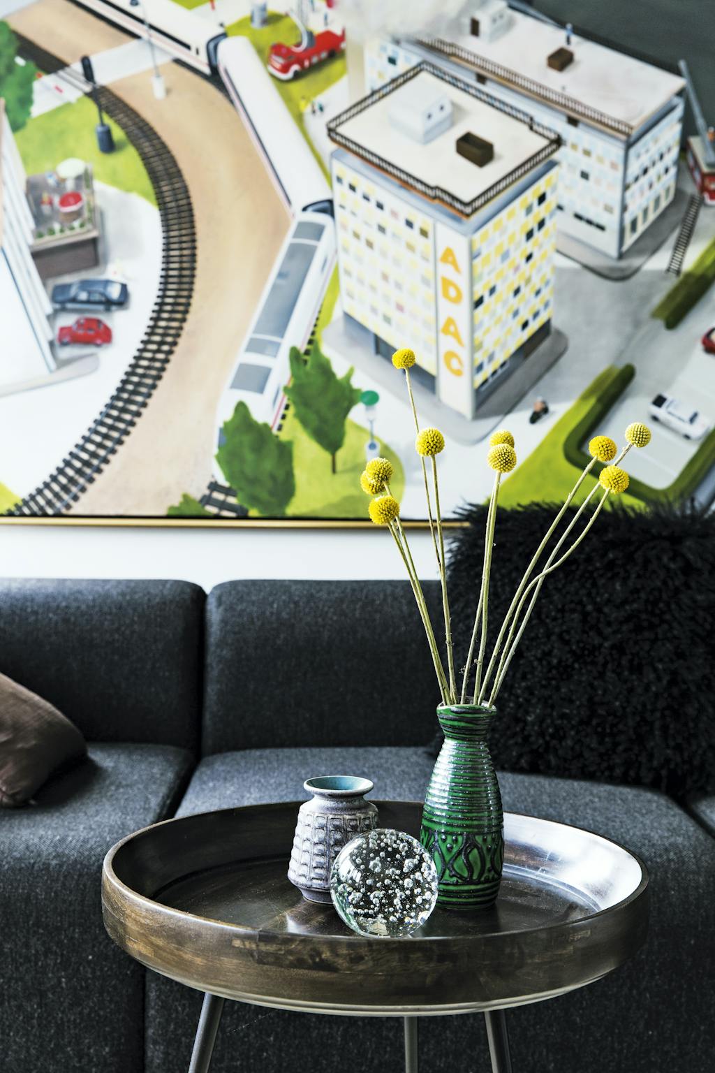 Et flot stilleben, der er et miks af smukke, mørke farver og forskellige teksturer. Sofabordet er et Mater Bowl-bord købt i Illums Bolighus. Keramikvaser og den franske brevvægt er loppefund. Modsatte side: De store lyse rum er som skabt til Eero Aarnios Hanging Bubble-stol. Over den mørkegrå sofa fra Hay hænger et Maria Torp-maleri af en modeljernbane købt på en auktion for en slik. Den gule glaslampe i vinduet er købt på Lauritz.com. Den giver et farvepift i sofahjørnet. Kludetæppe fra Hay.