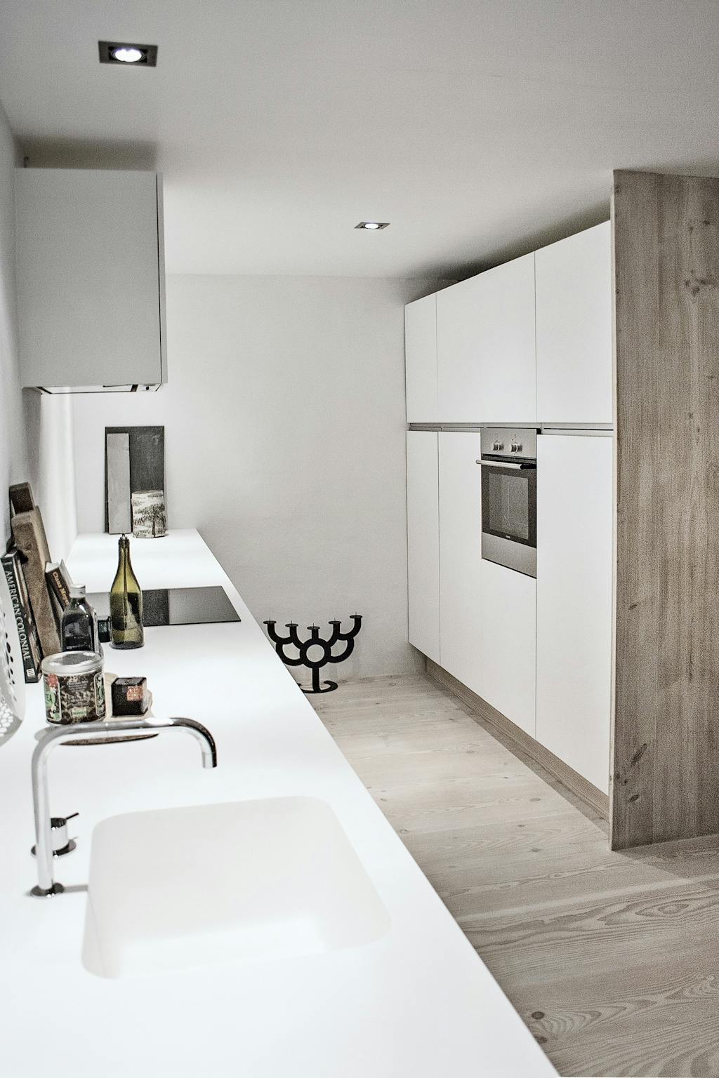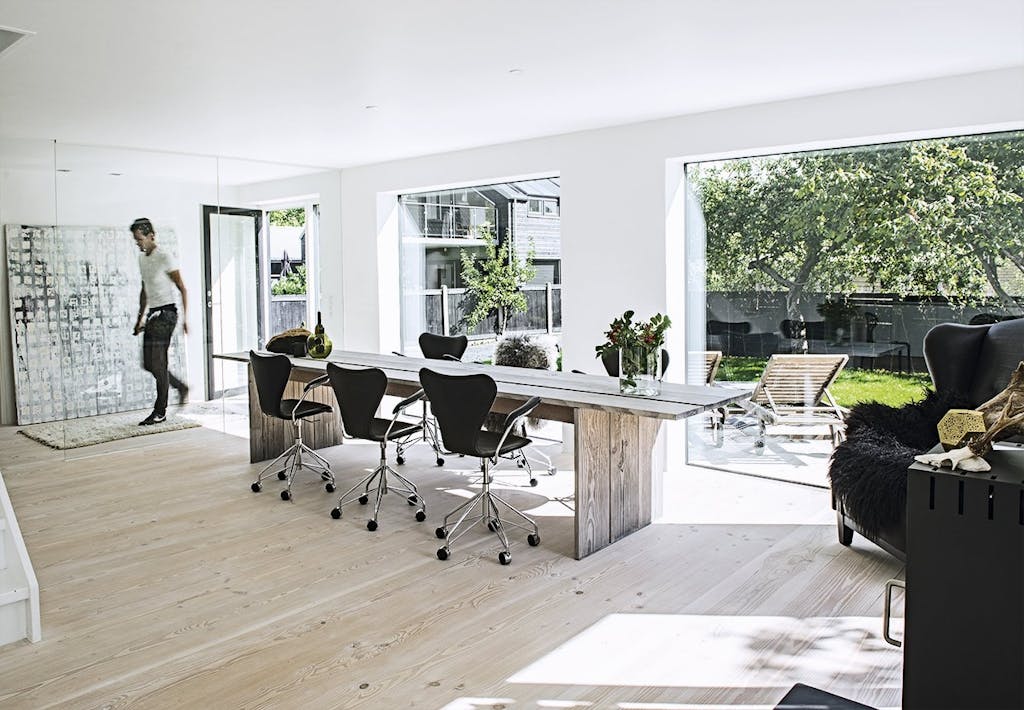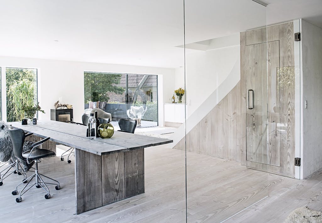 Indgangspartiet er også blevet en noget andet og mere imødekommende oplevelse. Når du åbner hoveddøren af glas, træder du næsten direkte ind i det store kombinerede køkken- og spiserum: masterrummet. Her er dog placeret en glasvæg mellem rummene, især for at afskærme lyden.