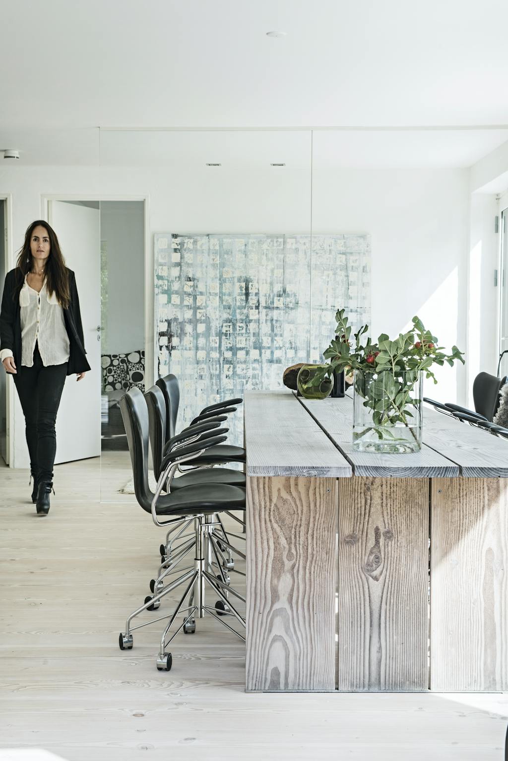 æbletræer stod i vejen for den nye terrasse, men så byggede ejerne da bare uden om stammen, så træet i dag vokser op gennem et ærbødigt hul i plan- kerne. Bente Tang og Mikkel Tang-Henriksen har strammet huset betydeligt op, mens den 60 år gamle have får lov til at være krøllet og vild. Det giver en næsten meditativ atmosfære, en skandinavisk ro og renhed.