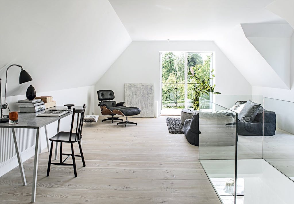 Trappen op til første sal er bevaret i sin grundform, men fyrretræsplanker- ne fra gulv og terrasse fungerer som beklædning på siden, så kroppen af træ på den måde føres gennem hele villaen. Resultatet er, at lyset for første gang i husets levetid kan strømme ind fra alle sider. Velkommen til fremtiden.