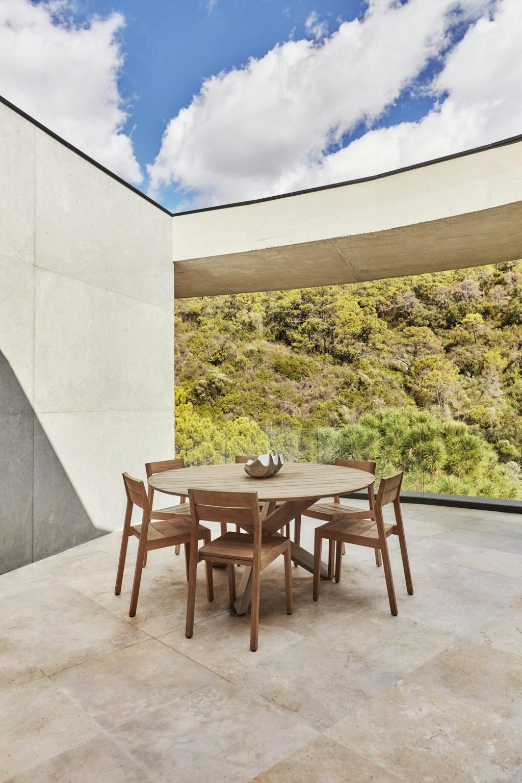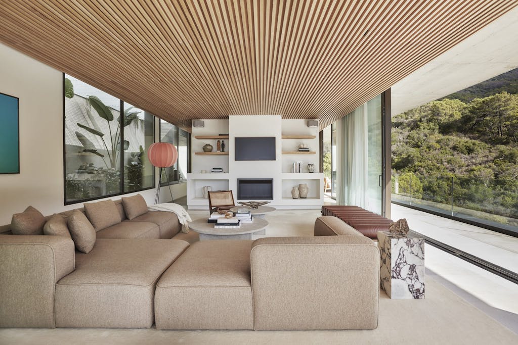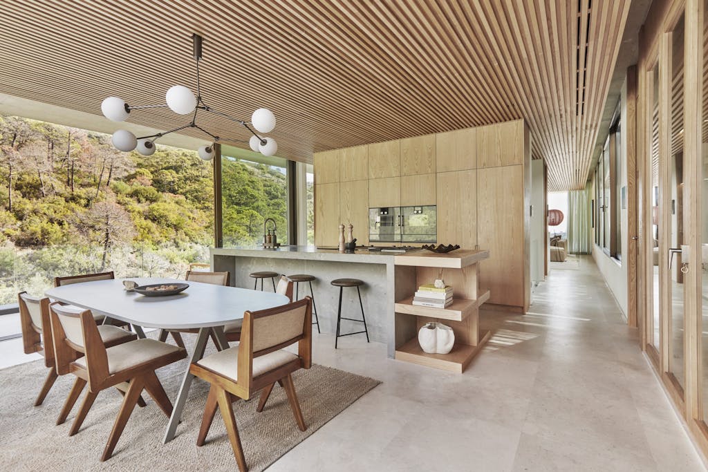 Store glaspartier indrammer den storslåede udsigt over bjergene, mens materialer som beton og træ skaber en elegant atmosfære. Villaens arkitektur er en hyldest til enkelhed og harmoni, men Emil Thorups interiør tilføjer en dansk designsignatur, der gør hjemmet både moderne og tidløst.
