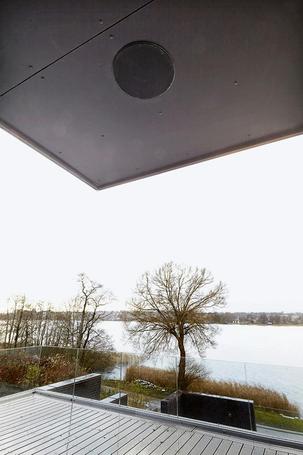 Udsigten over søen bliver ikke mindre skøn, når den akkompagneres af Beethoven - eller Coldplay. Overalt i huset finder man indbygningshøjttalere, naturligvis også på terrassen.