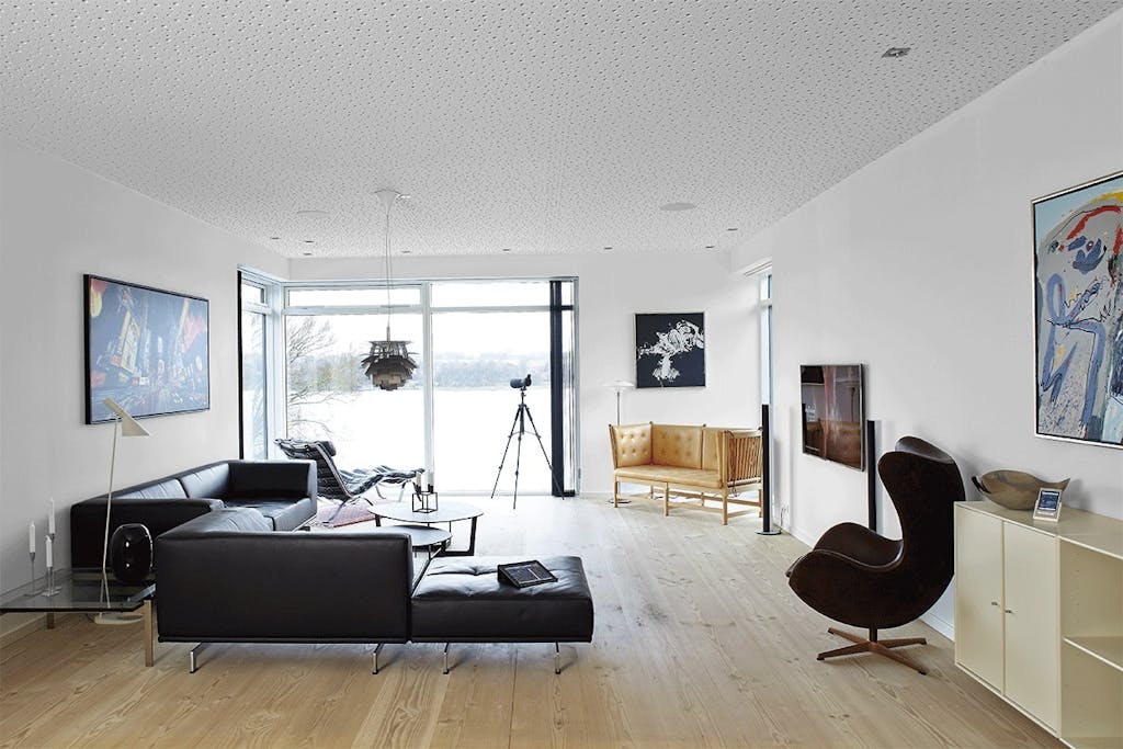 Stuen er indrettet til at nyde både tv og god lyd i dejlige omgivelser - vel at mærke uden, at der står store højttalere på gulvet eller hænger et musik-anlæg på væggen. Sonos-systemet bliver styret trådløst fra iPhone, iPad eller Sonos-kontrollen og betyder, at man kan afspille musik i Hi-Fi kvalitet med et enkelt tryk på skærmen. Til venstre bordet PK 61 af Poul Kjærholm. Sofaerne er Delphi fra Erik Jørgensen, og Ægget er en special edition, nr. 99 af 999 eksemplarer. I baggrunden lyser Børge Mogensens tremmesofa flot op.