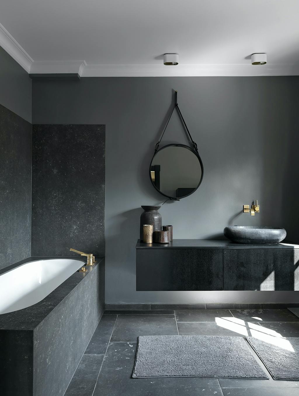 Det elegante badeværelse er skabt med granitfliser og en matchende stenplade på baderumsmøblet fra Multiform Copenhagen. Vasken er håndskåret sten, og stenen ved badekarret er et stort laserskåret stykke. Armaturerne i messing er fra Dornbracht. En samling etniske vaser fundet på rejser og i Rue Verte er sat sammen med et spejl med læderramme designet af Jacques Adnet fra Gubi i et blødt og organisk look.