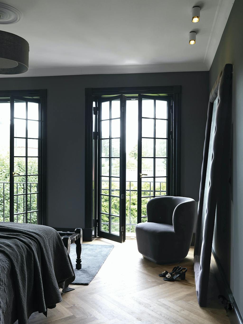 Grå skaber ro i soveværelset, hvor franske døre giver et flot lysindfald. Mange af rummene i huset er blevet lavet større, men rummet her er gjort mindre for at skabe plads til et walk-in-closet.