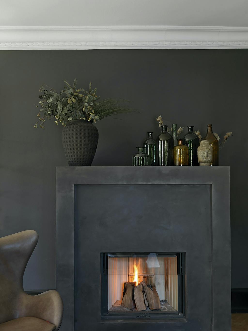 Messingkøkkenet står skarpt i det stilfulde hjem, som ellers er holdt i mørke farver.