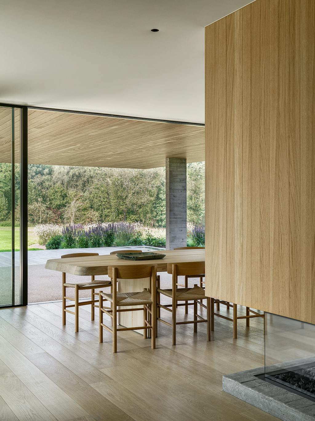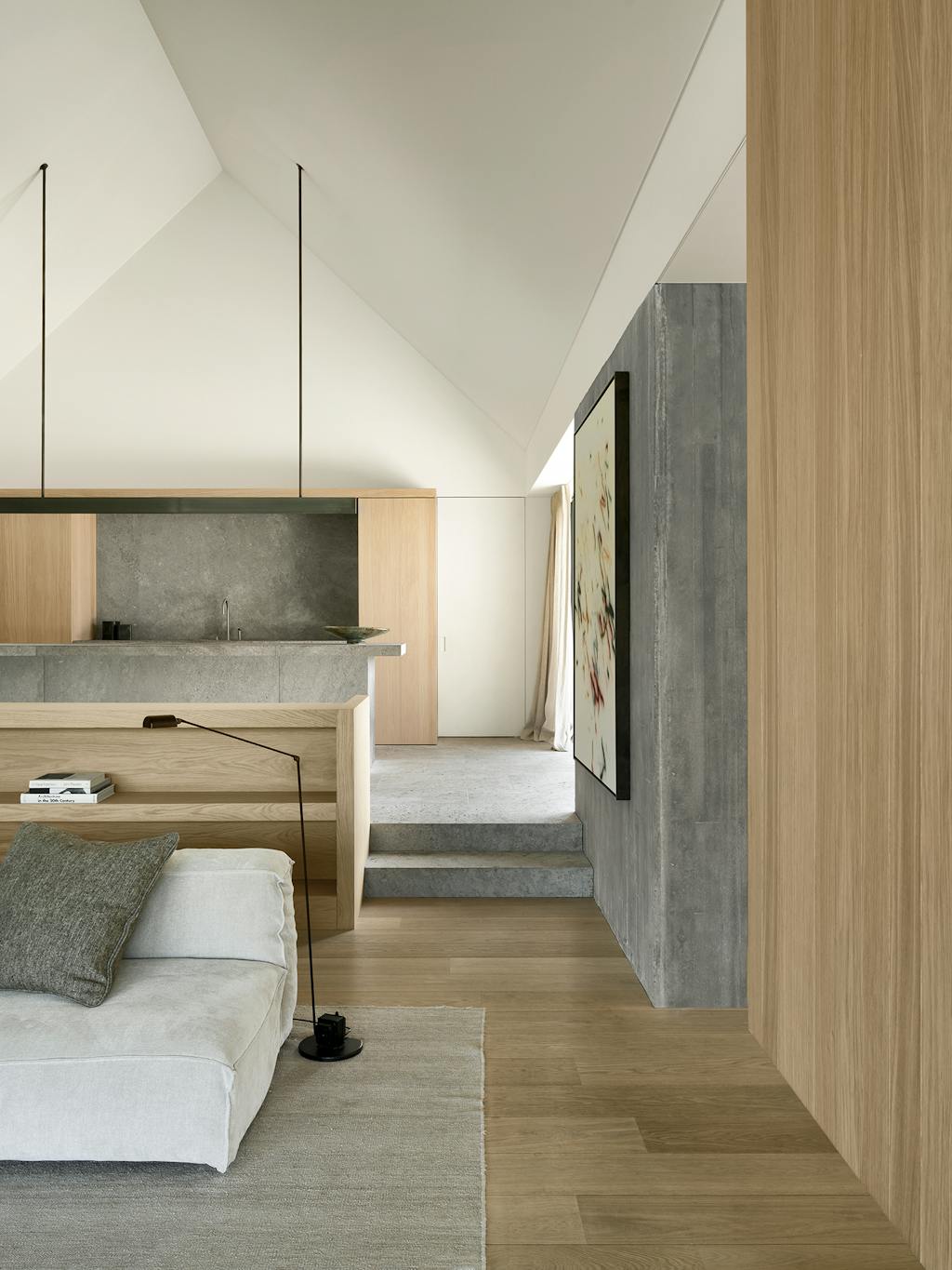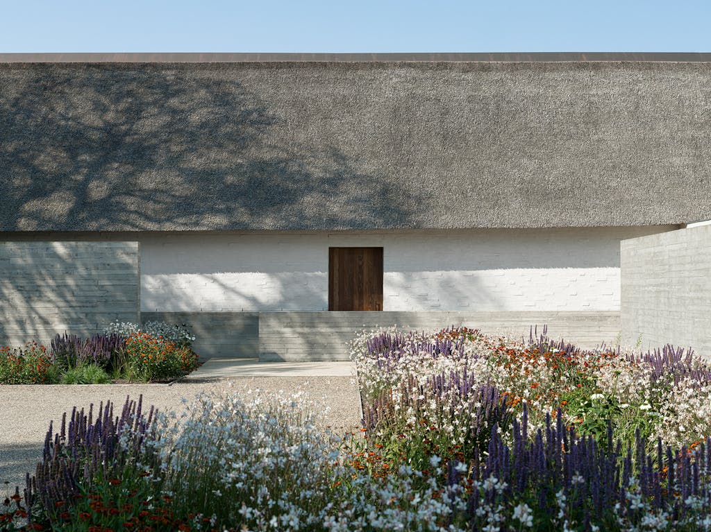 Indvendigt understøtter en afdæmpet palet af pudsede vægge, belgisk eg og gråsten det konsekvente fokus på holdbare, naturlige materialer. I kombination med en åben gulvplan, hvor der stort set ikke er vægge i opholdsrummene, skaber det en rummelig og eksklusiv oplevelse.