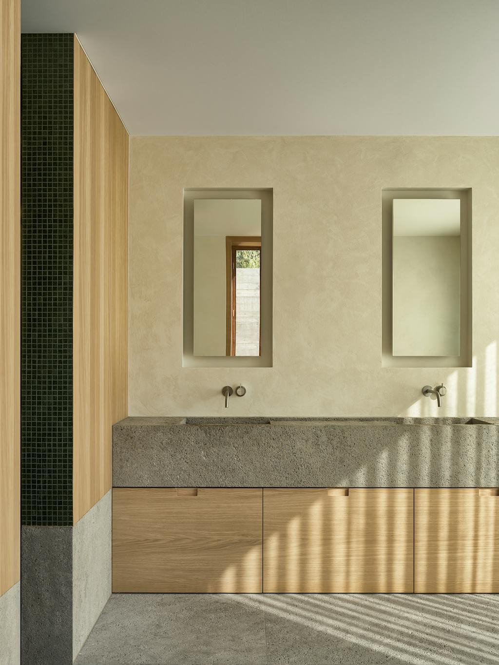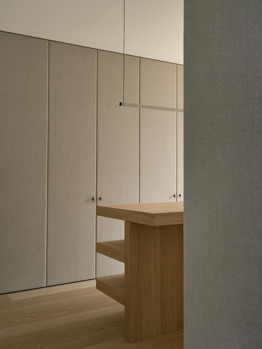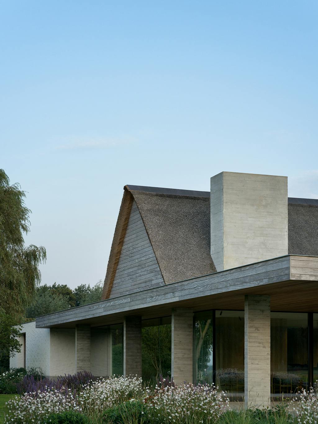 Indvendigt understøtter en afdæmpet palet af pudsede vægge, belgisk eg og gråsten det konsekvente fokus på holdbare, naturlige materialer. I kombination med en åben gulvplan, hvor der stort set ikke er vægge i opholdsrummene, skaber det en rummelig og eksklusiv oplevelse.