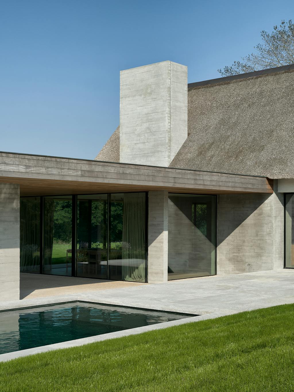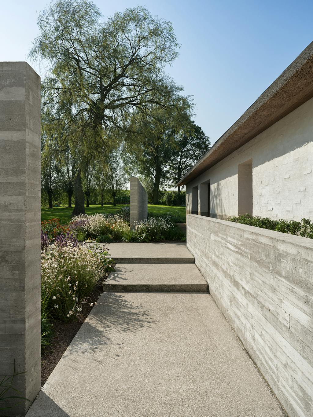 Udenfor er der blevet støbt halvmure i beton langs husets ydermure for at bryde landskabet op og skabe en mere dynamisk overgang mellem land og have. Samtidig har disse mure skabt forskellige uderum og dermed født nye muligheder for at gå ture, sidde, spise og bade på en måde, som føles som en mere integreret del af huset.