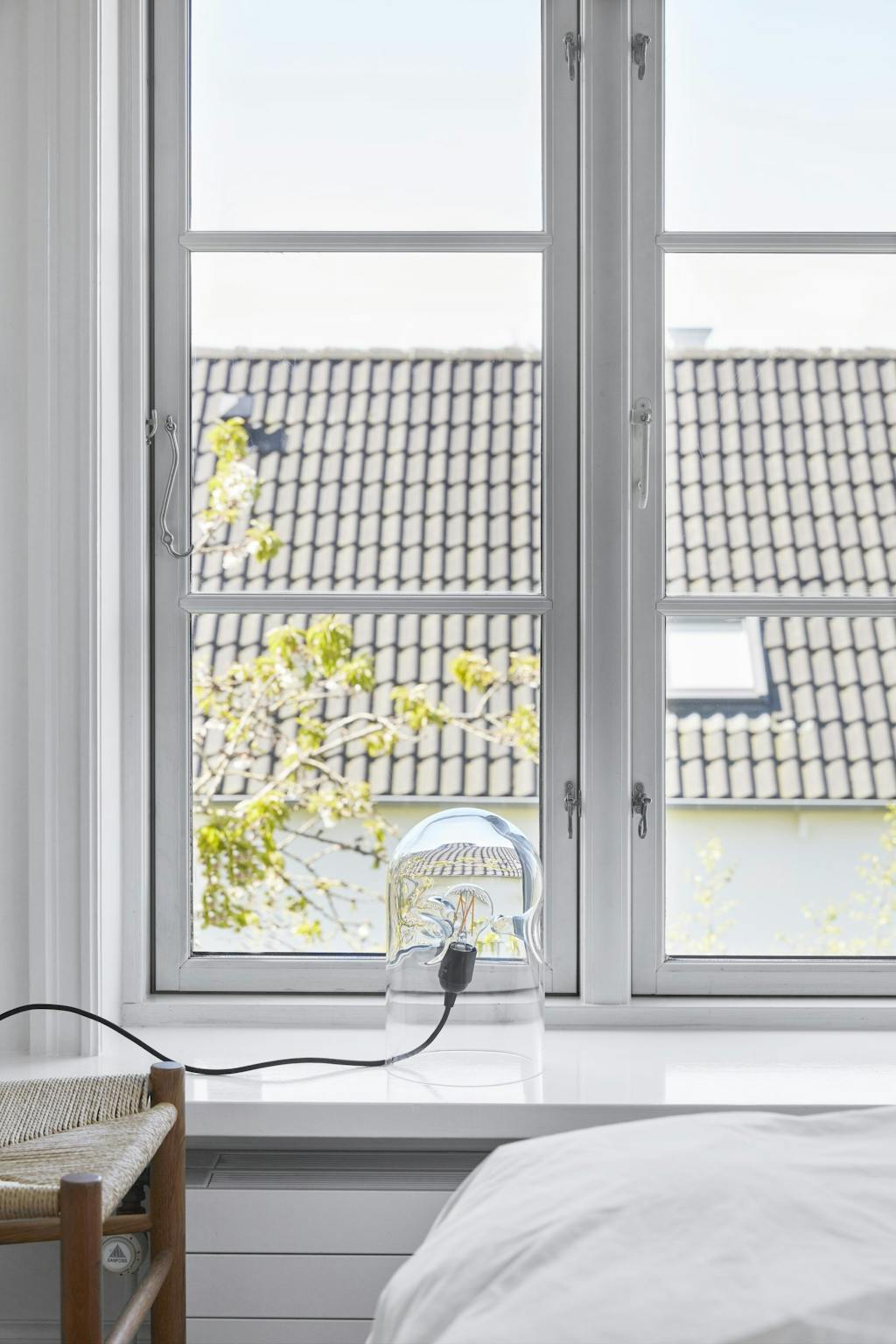 Derfor har de også bevaret de originale vinduer i stedet for eksempelvis at sætte småsprossede i, der ville tage meget af lyset, som er det, familien holder allermest af ved huset. Det samme gælder for vinduerne i entréen og husets indvendige trappe, der er klassisk sort- og hvidmalet; det er vigtige detaljer for husets udtryk. Og da der skulle nyt gulv på i nogle rum på førstesalen, valgte parret at gå med fyrretræ som i resten af huset i stedet for egetræsplanker, som mange nok ville have valgt.