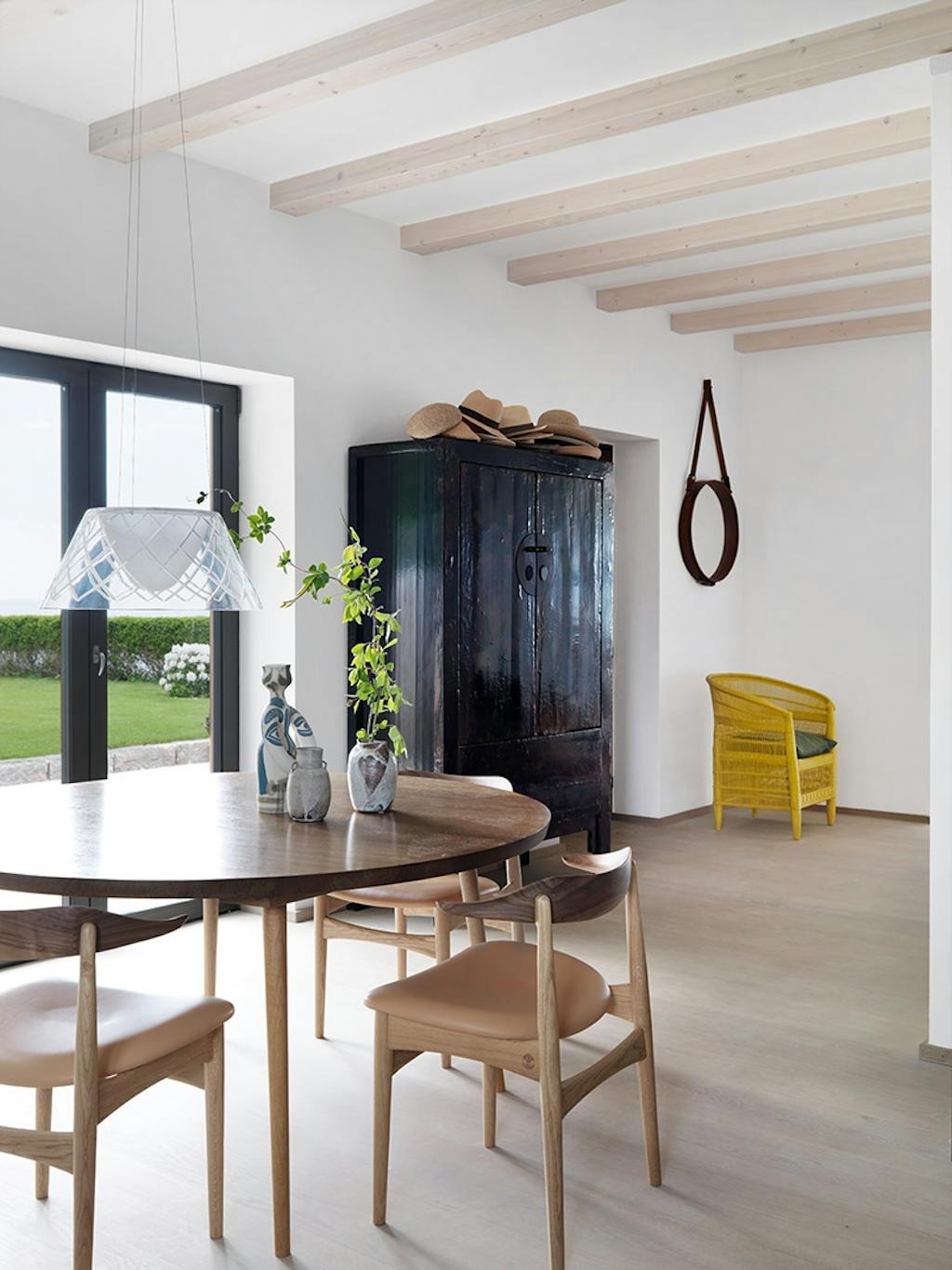 En lys farvepalet transcenderer hjemmets køkken og kombineret opholds- og spisestue, og brydes af kontrastfulde indspark, som den gule flettede stol i hjørnet og det sorte vintage skab.
