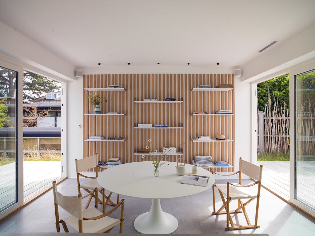 Husets formsprog og materialevalg trækker tydelige tråde til Arne Jacobsens æstetik – det rene udtryk, den hvide base, brugen af glas og den nænsomme integration i omgivelserne. Men samtidig er her klare referencer til japansk arkitektur: roen, enkelheden, de naturlige materialer og den måde, lyset får lov at spille en hovedrolle på.