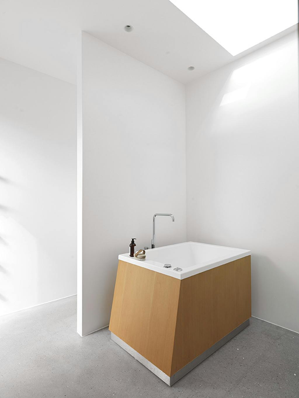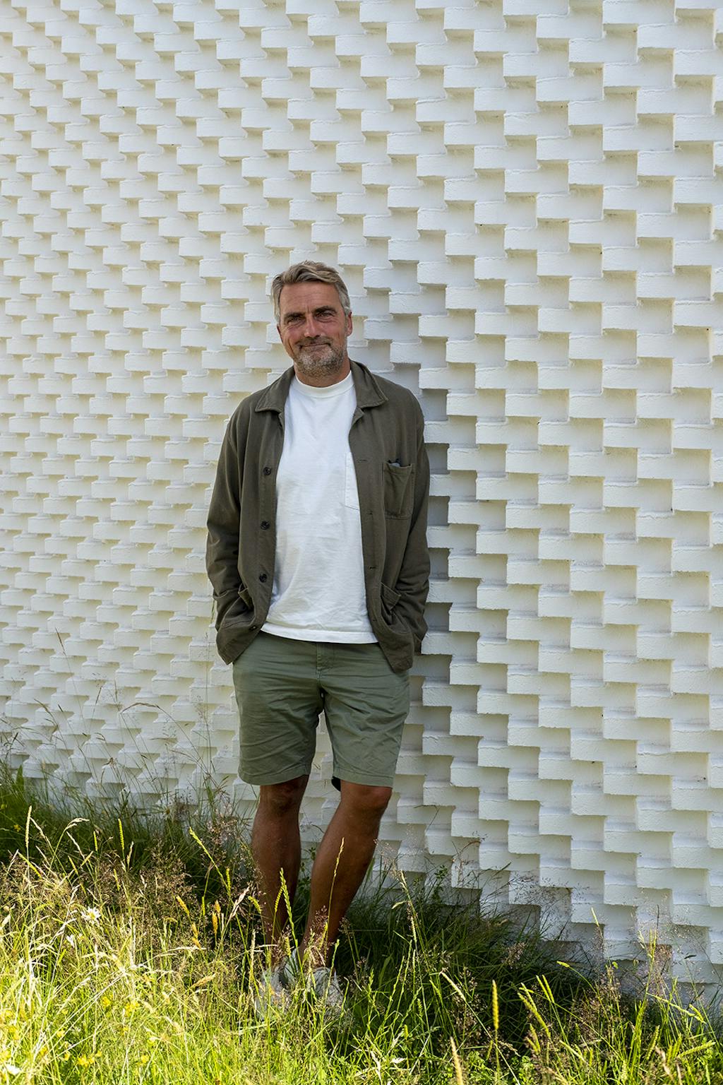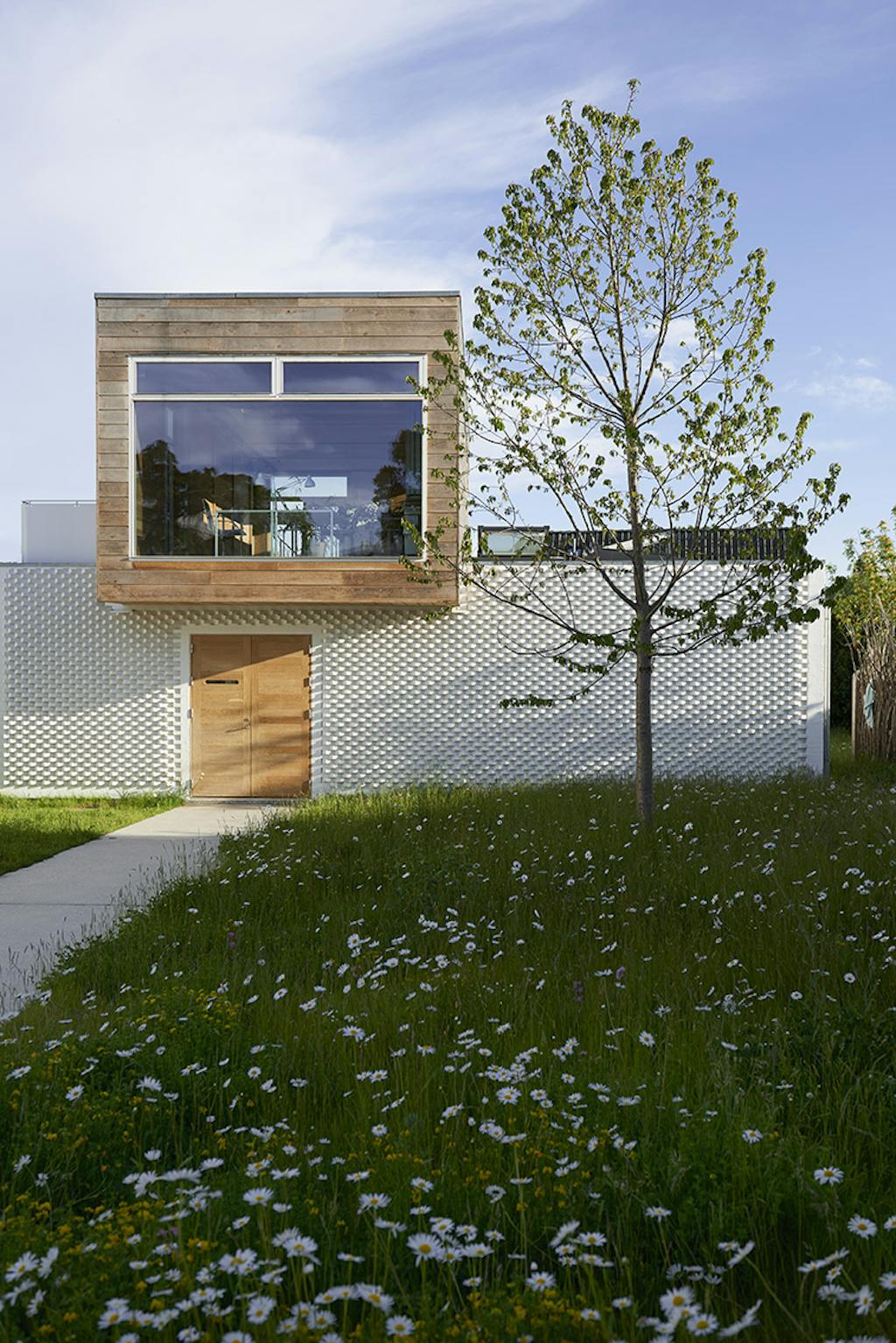 Tværtimod opstår en næsten poetisk balance mellem arkitektur og natur. Facaden er udført i hvidkalkede kridtsten, arrangeret i et grafisk reliefmønster, som giver liv og tekstur til overfladerne.