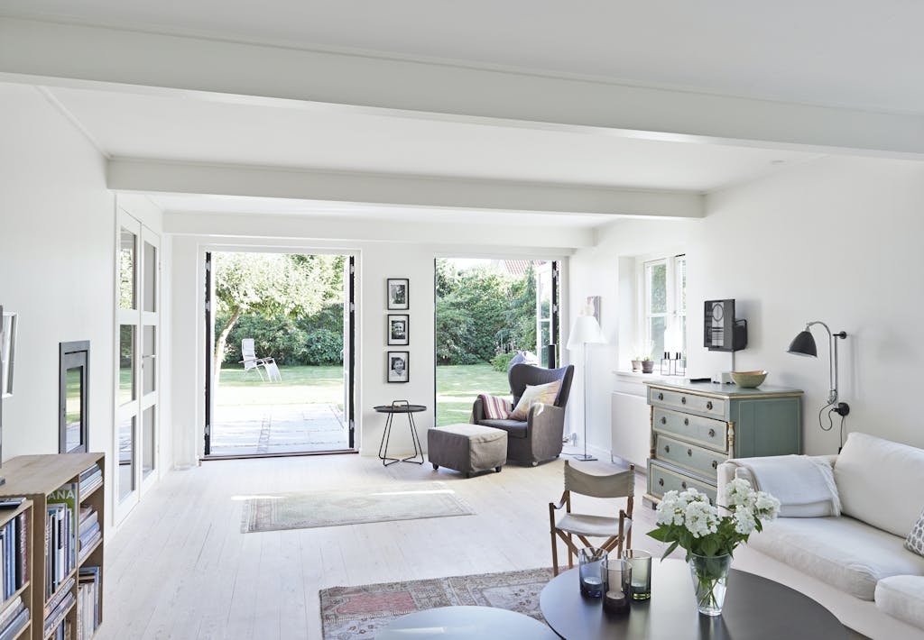 I tilkøb fik familien udnyttet pladsen i tilbygningen til en funktionel kontorplads og teenage-stue, ligesom linjerne blev skærpet i de øvrige opholdsrum, hvor et par døre blev blændet og flere skabe kom til. Samtidig fik huset to nye badeværelser og nye, større vinduespartier, der trækker haven ind i stuen, nyt bryggers, nye vinduer og døre samt renoveret gavle og facader. Det hele orkestreret af arkitekten Nanna Bering, der jonglerede familiens ønsker og behov samtidig med avancerede byggeudregninger og den overordnede plan for et helstøbt hus. Og effekten er ikke udeblevet.