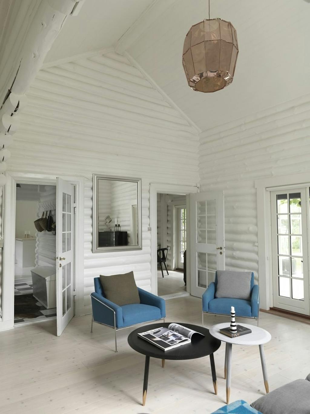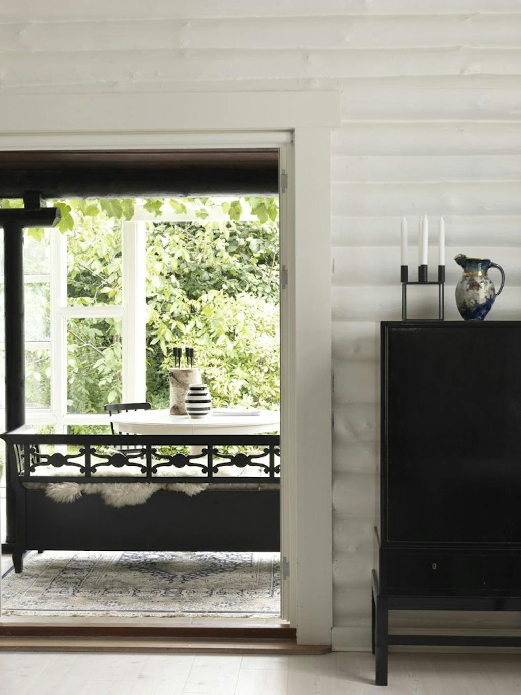 Det sorte træhus, opført i massivt rundtømmer med hvidmalet interiør, danner en enkel og grafisk ramme om indretningen, som byder på masser af nyt spændende design sat sammen med gamle møbelklassikere. Sara Houborg er salgschef hos møbel- og lampeproducenten &Tradition, og interessen for bolig og design fornægter sig da heller ikke privat. Sara Houborg elsker at flytte rundt på møblerne og skabe nye sammenhænge i hjemmets rum.