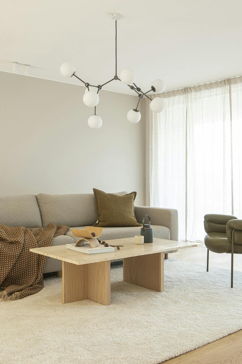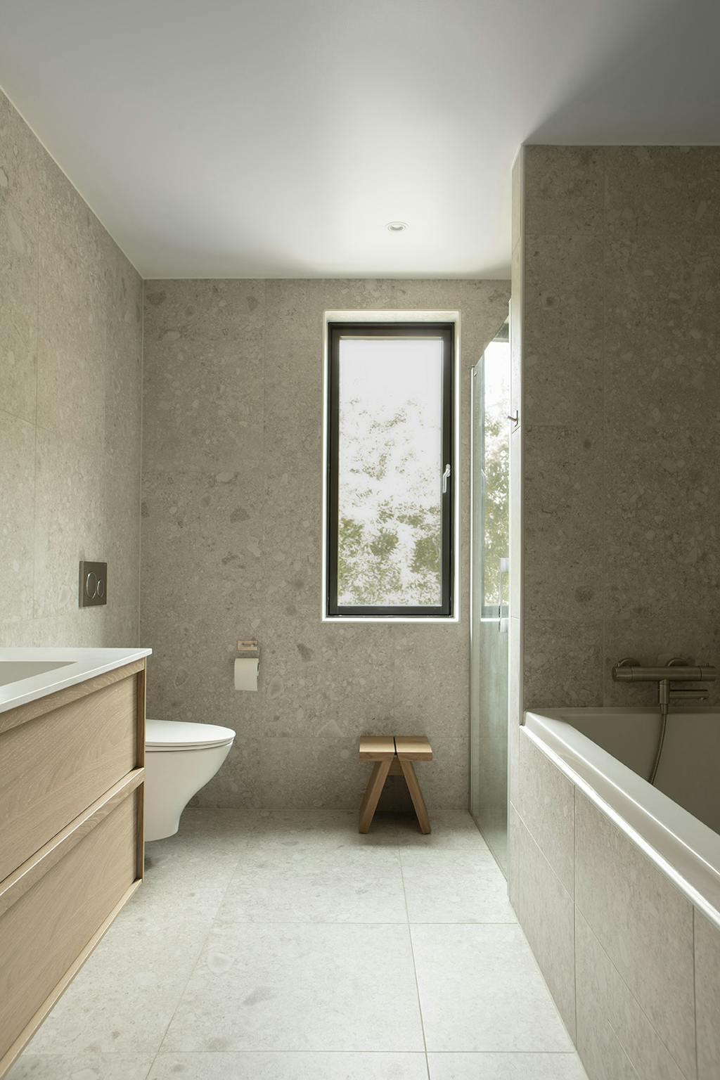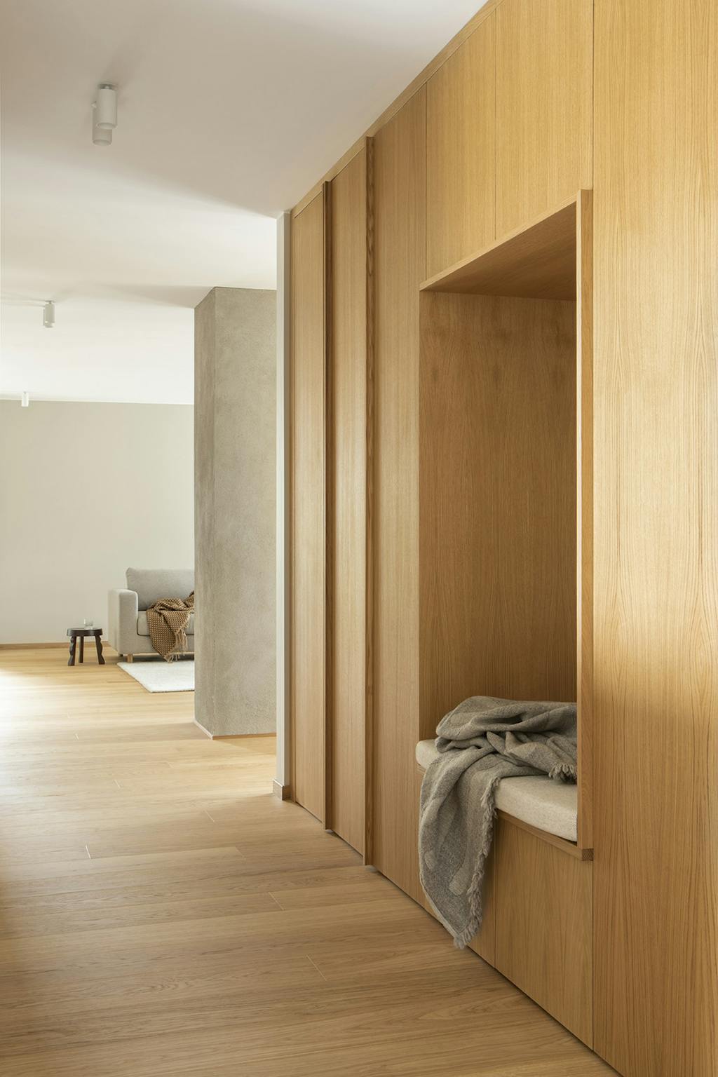 I alle rum, fra det store køkken-alrum til soveværelset, de brede gange, trappen, gulvet og de indvendige døre, ser man varmt egetræ. Store vinduer strækker sig fra gulv til loft, og i soveværelserne og tv-stuen er der et dejligt blødt væg til væg-tæppe. Ellers er farvepaletten lys med indslag af sten, læder og bløde tekstiler samt detaljer i mørkere jordfarver.