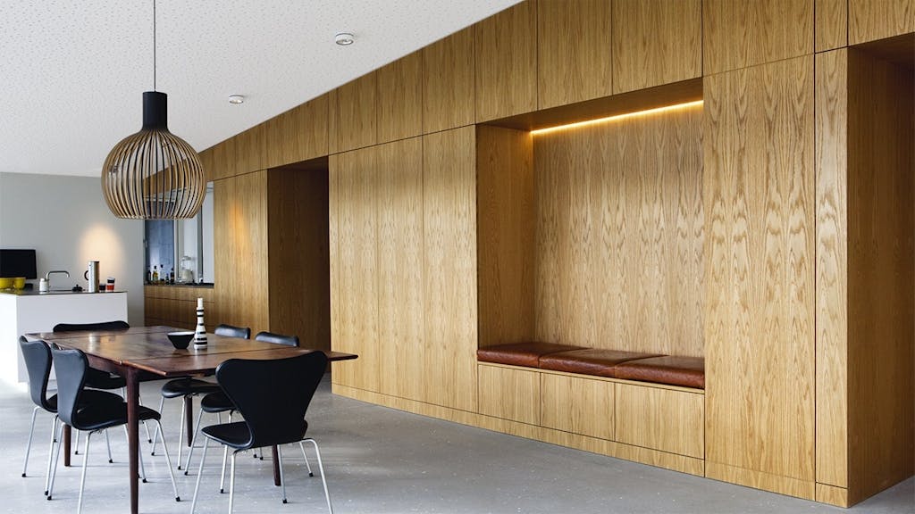 Det store rum er en kombination af køkken, spisestue og opholdsstue, hvor snedker Morten Pedersen fra Culina har lagt stor energi i at tilpasse trævæggens mønster. Culina står også for køkkenet, hvor ovn, køleskab mm. er gemt bag panelerne. Midt på væggen en siddekrog med læderhynder.