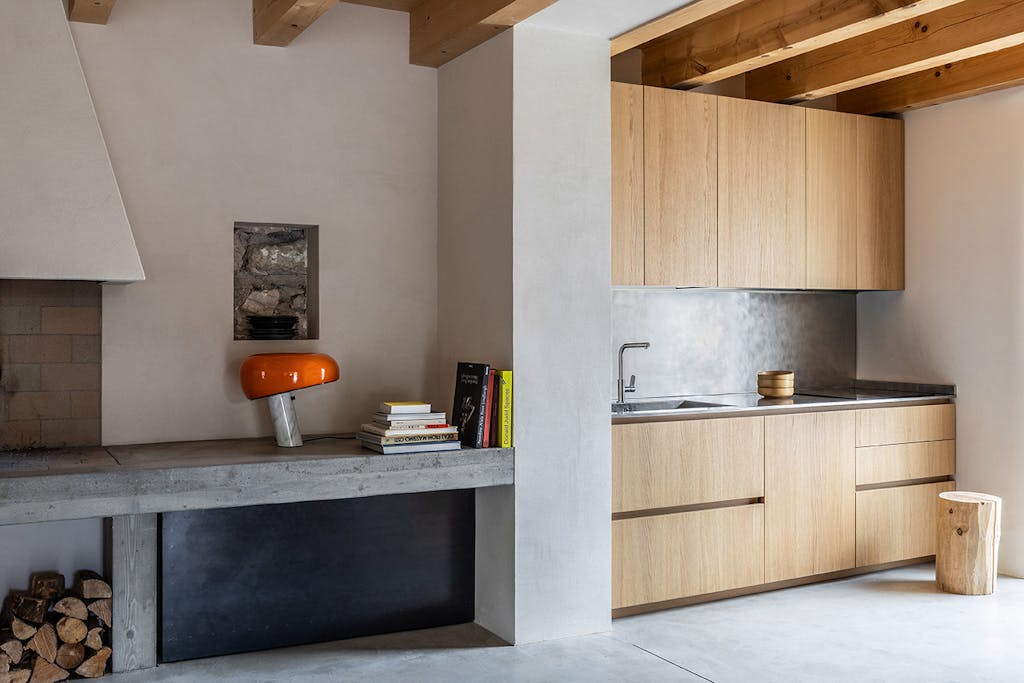 Her er mange møbler skræddersyede, og enkelte elementer, som håndvasken og pejsen i beton, er støbt på stedet.